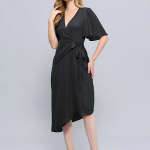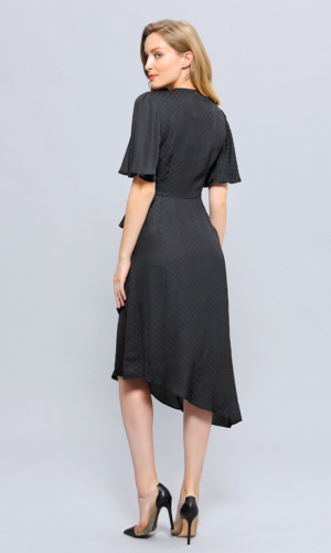 78€Edgy and seductive, this dress a real style statement. It highlights gracefully any silhouette: featuring a sophisticated wrap on bust knotted on left side, V-cleavage, asymmetric hem, wide sleeves. A unique shape that assures you an original yet feminine look. Cut in a high-end doted mat and satin fabric. A timeless piece useful for various occasions.