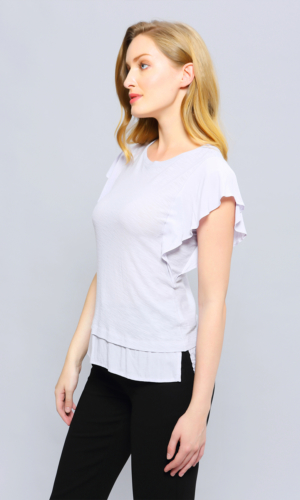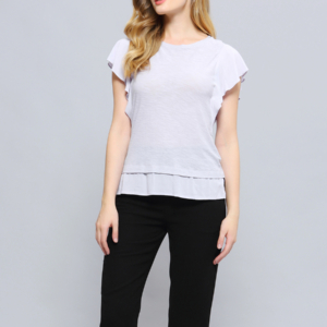 21€Featuring a stretch breathy jersey, this piece is ideal for the hottest days of the summer. Clever cutting around the sleeves displaying wide ruffles and yet a tight and decent fitting. Enhanced with a double frill panel on the bottom. An easy to wear piece to fit with many different skirts and pants, like for example our Minimalist Capri Pants.