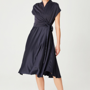 128€A piece that elegantly emphasizes any type of figure: fitted at the waist with a wide belt, covered shoulders, V-neckline and generous skirt volume up to the knees. You will particularly appreciate the soft satin fabric offering nice effects in movement. Suitable for various occasions this timeless dress will be a safe option for your chic evenings.