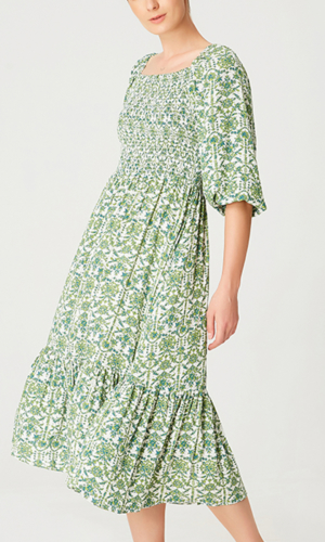 Fit-and-flare smocking dress with geometrical print