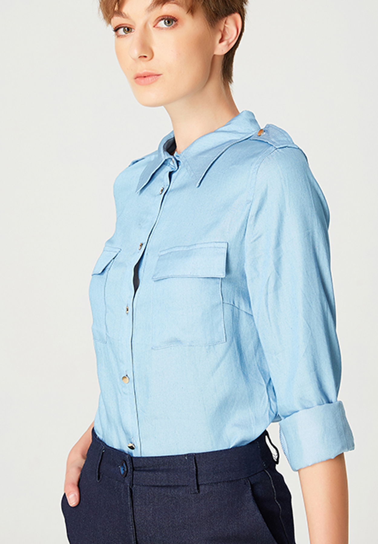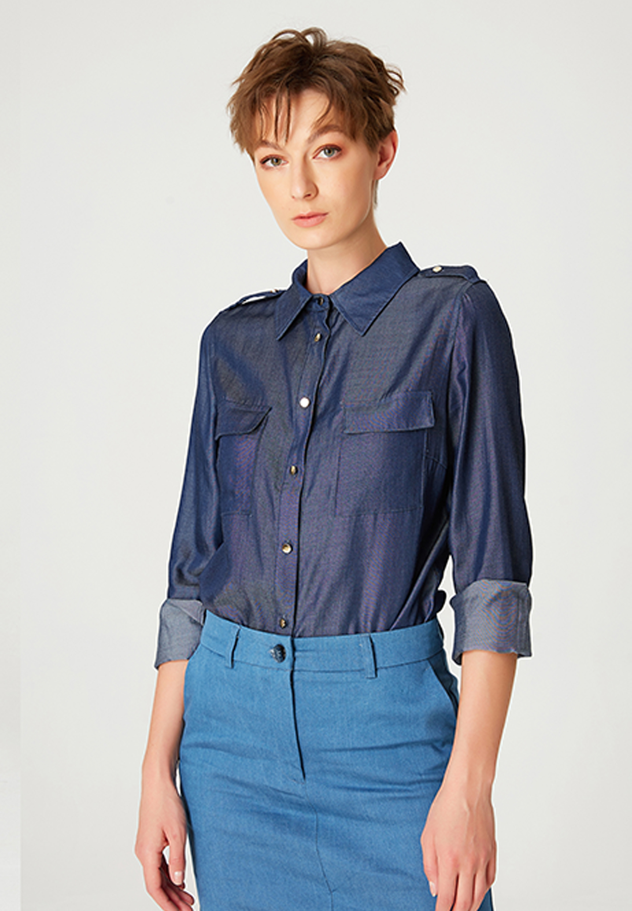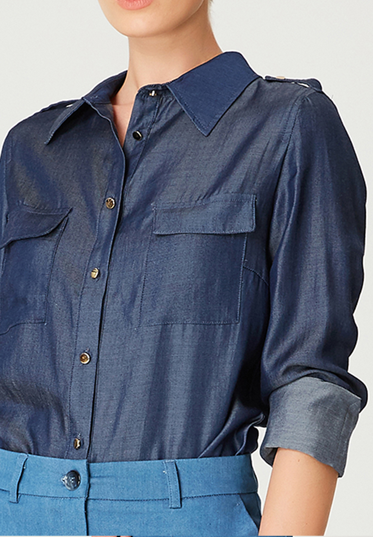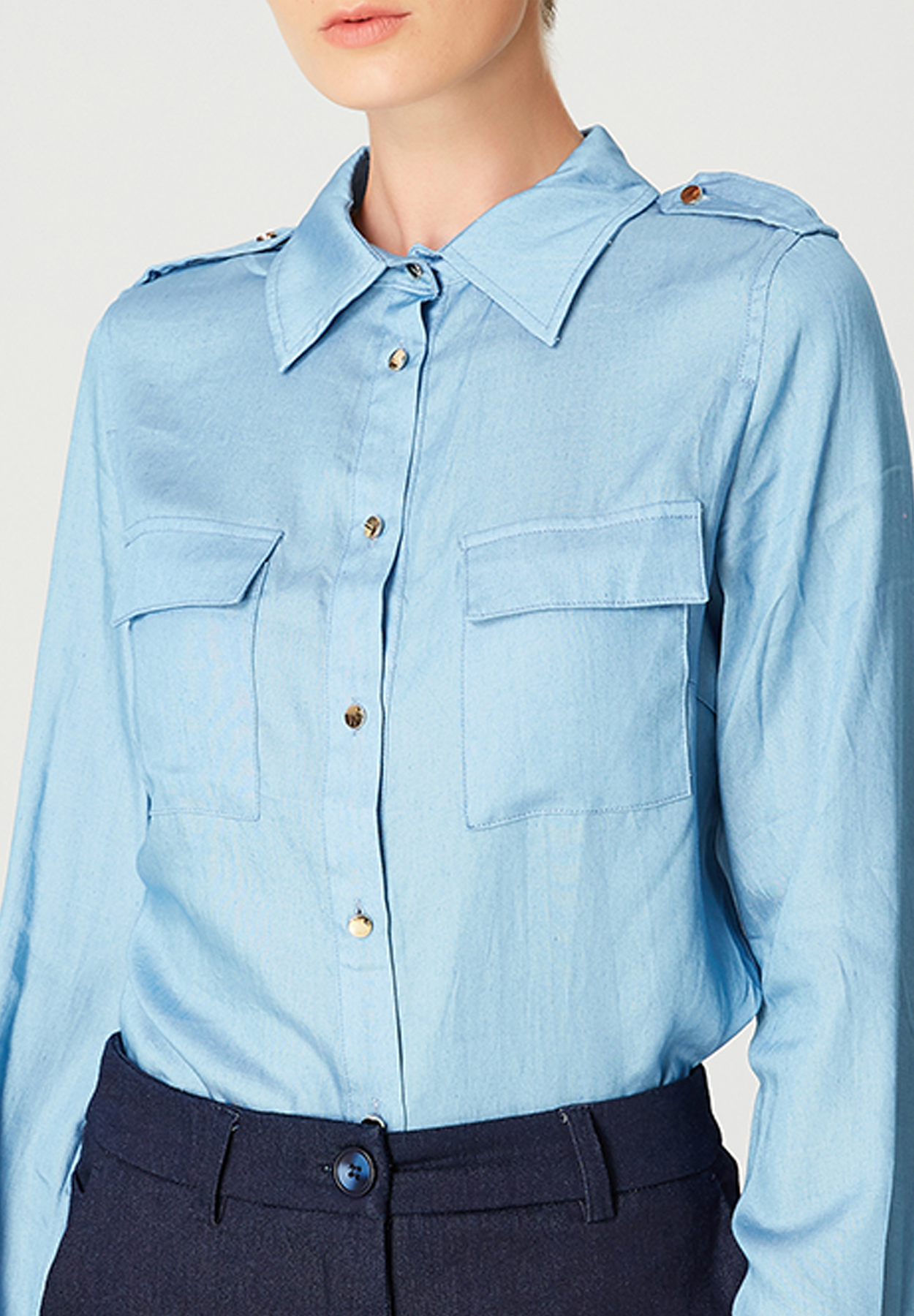 A shirt cut in a soft, supple and breathable Tencel fabric, reminding denim appearance. Two blue colors options. A classic and timeless fit featuring two flap-patch pockets, shoulder straps and metal buttons. Arrange in several ways according to your desires: buttoned up and tucked into the pants for a flawless and sophisticated style, or slightly open at the neckline and sleeves rolled up for casual getaways. Wear without moderation, at the office or in the evening.