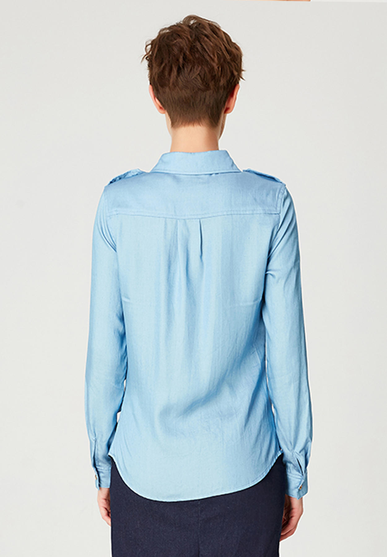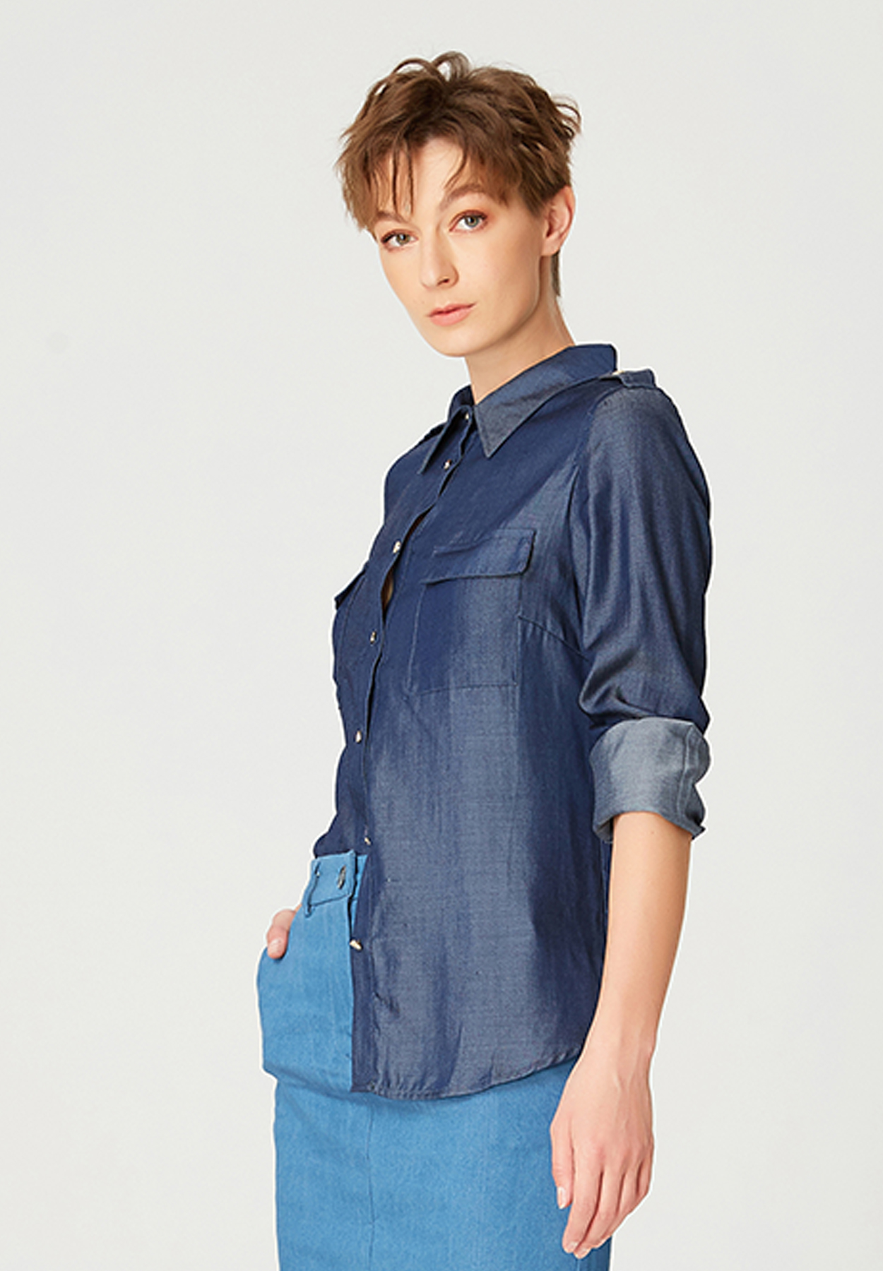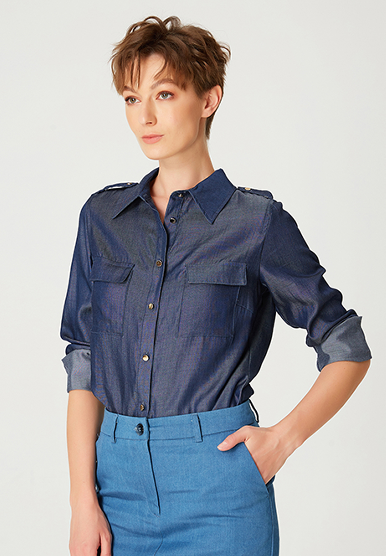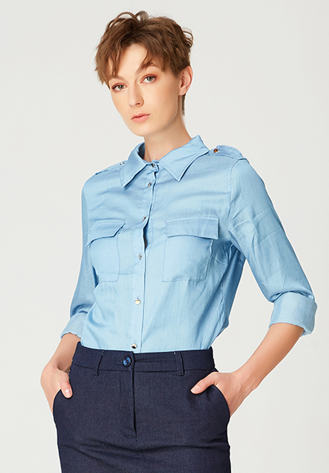 A shirt cut in a soft, supple and breathable Tencel fabric, reminding denim appearance. Two blue colors options. A classic and timeless fit featuring two flap-patch pockets, shoulder straps and metal buttons. Arrange in several ways according to your desires: buttoned up and tucked into the pants for a flawless and sophisticated style, or slightly open at the neckline and sleeves rolled up for casual getaways. Wear without moderation, at the office or in the evening.