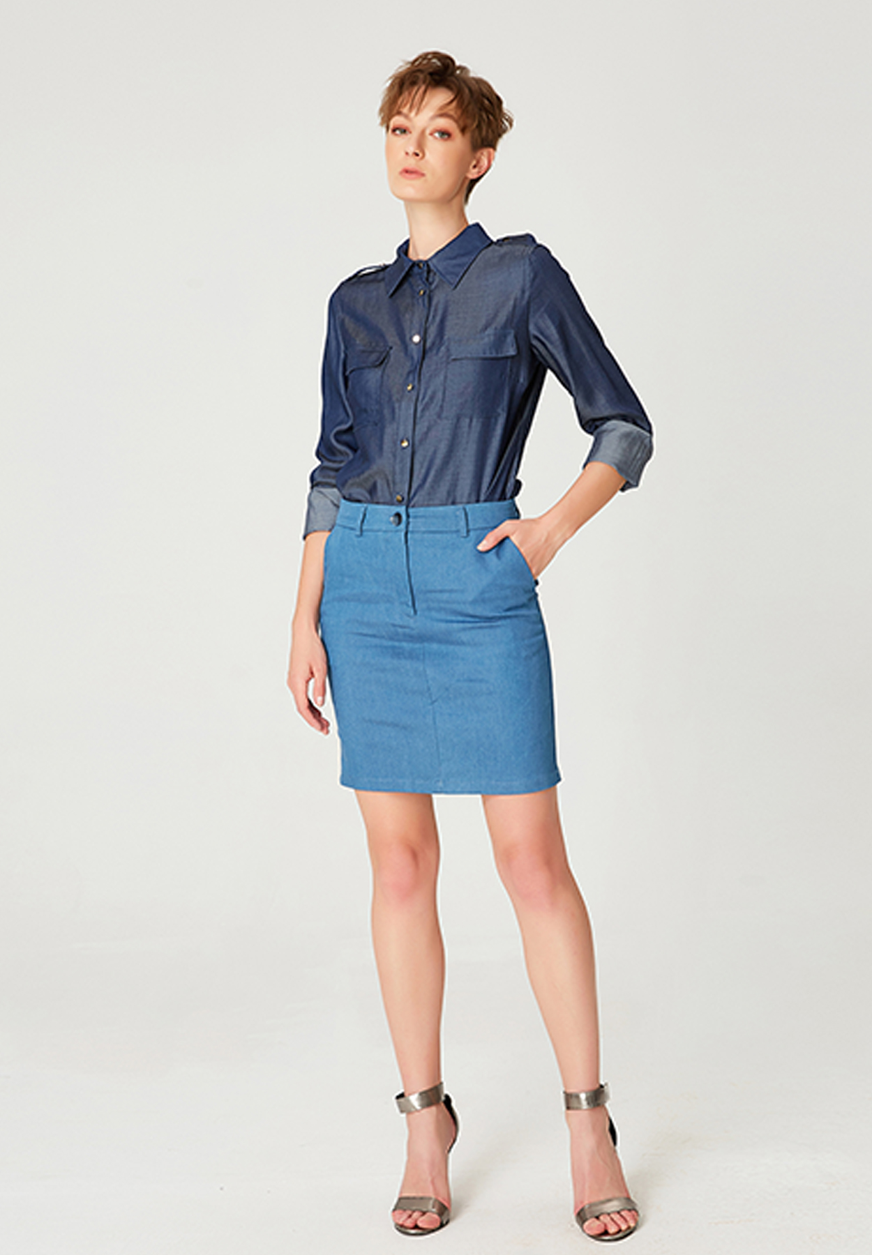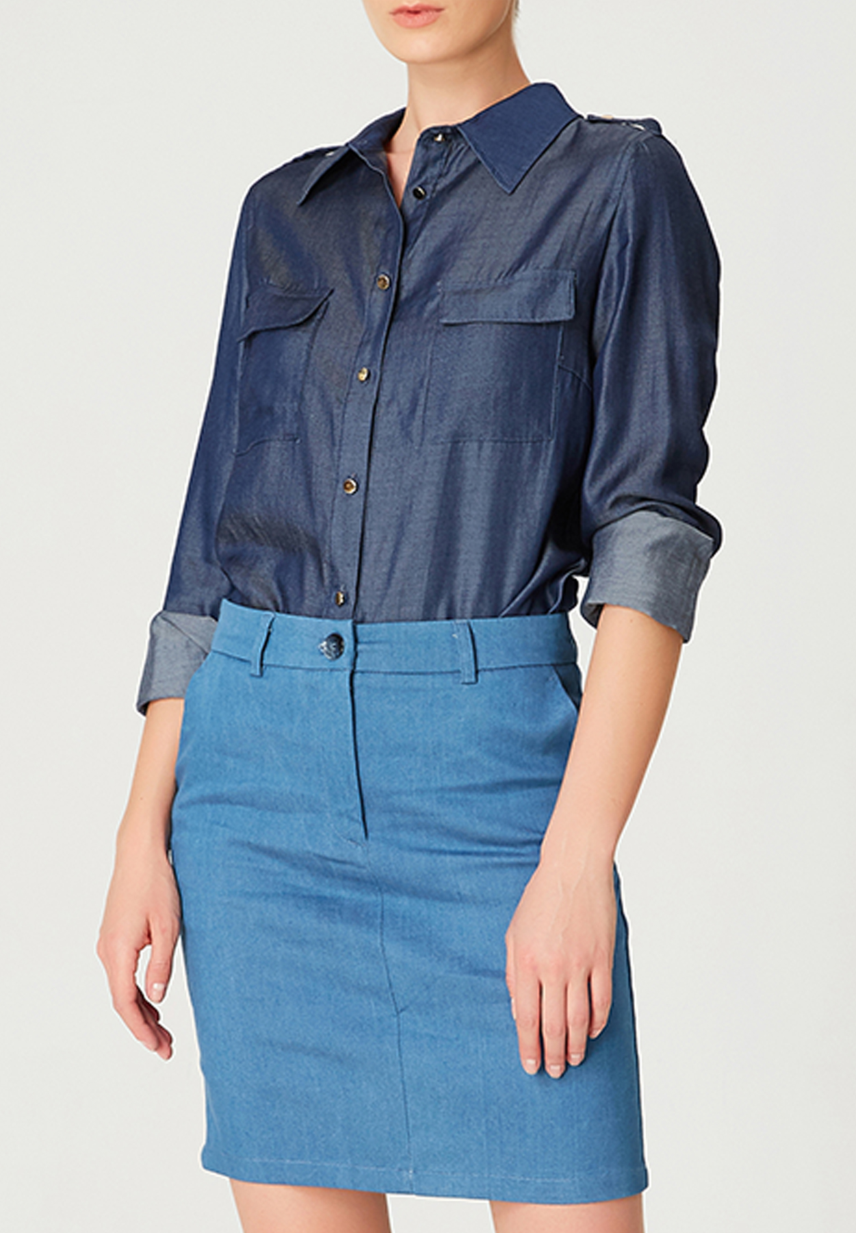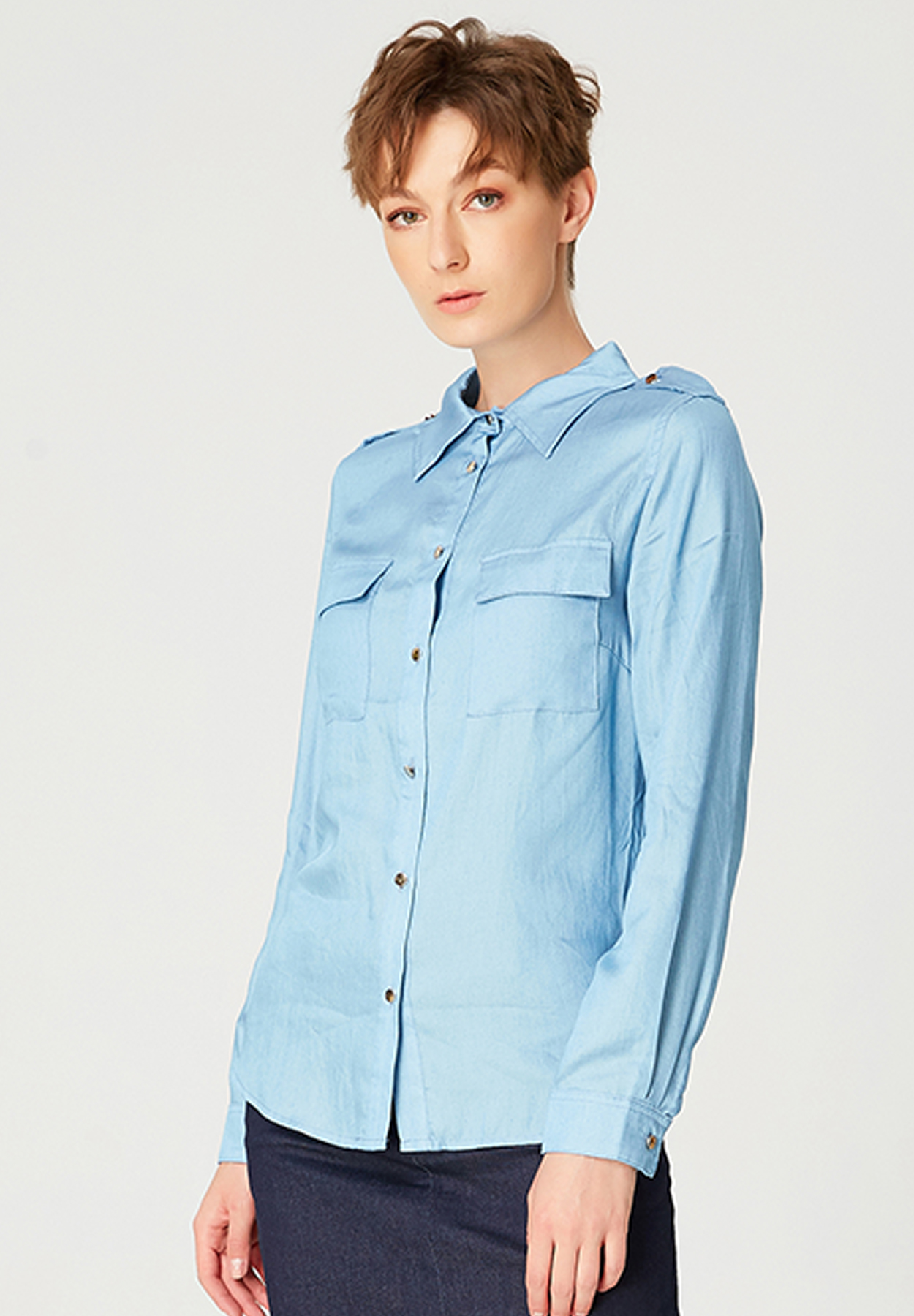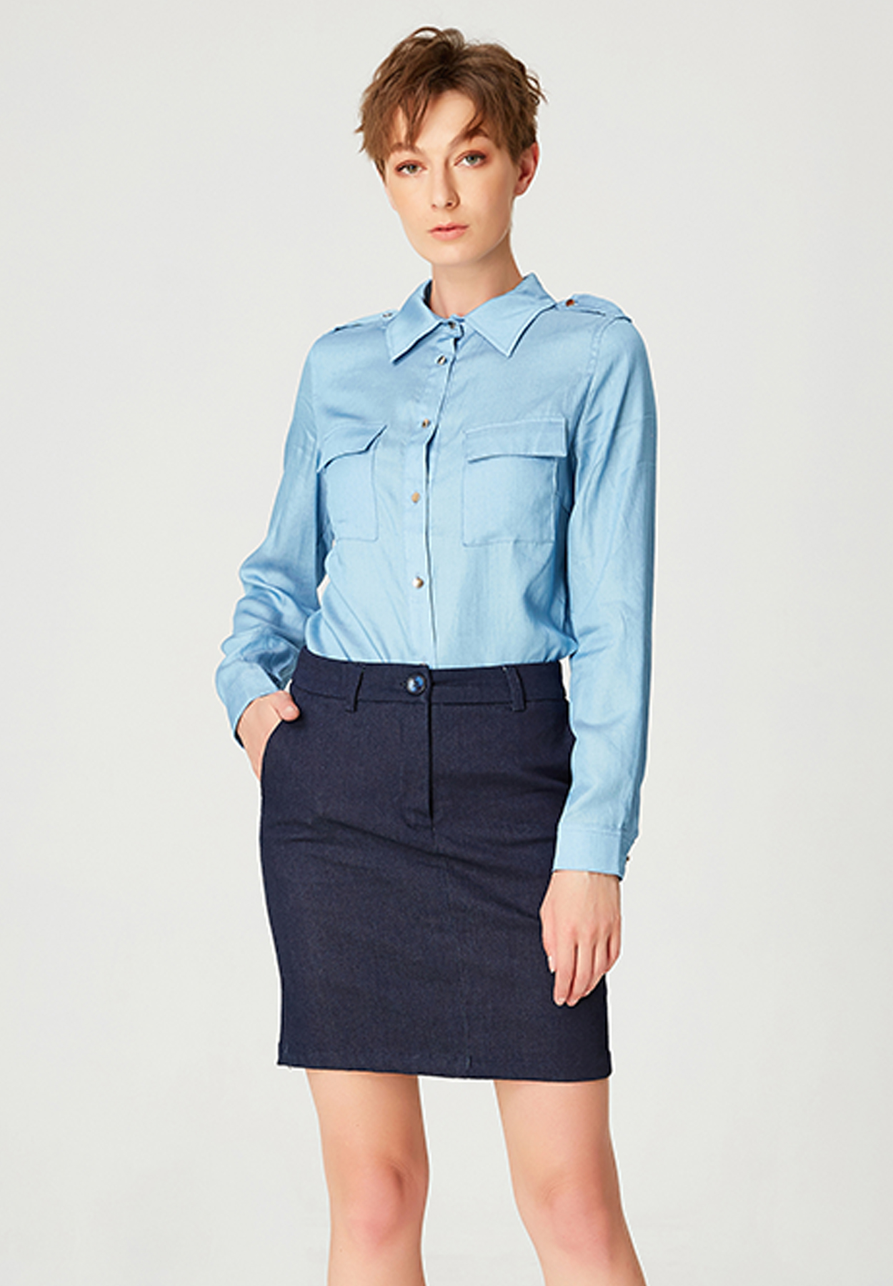 A shirt cut in a soft, supple and breathable Tencel fabric, reminding denim appearance. Two blue colors options. A classic and timeless fit featuring two flap-patch pockets, shoulder straps and metal buttons. Arrange in several ways according to your desires: buttoned up and tucked into the pants for a flawless and sophisticated style, or slightly open at the neckline and sleeves rolled up for casual getaways. Wear without moderation, at the office or in the evening.