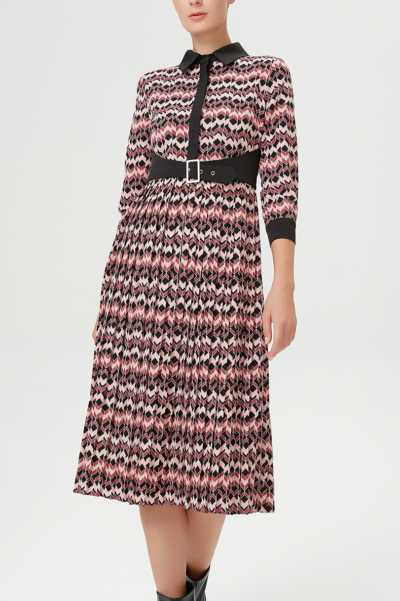A real statement piece with a structured cut that highlights your figure; adjustable application belt, contrasting collar and placket. A classic dress-shirt cut base with a dynamic print and a pleated flared skirt. To accessorize with boots or ankle boots for a fierce look or stilettos for a more feminine look.