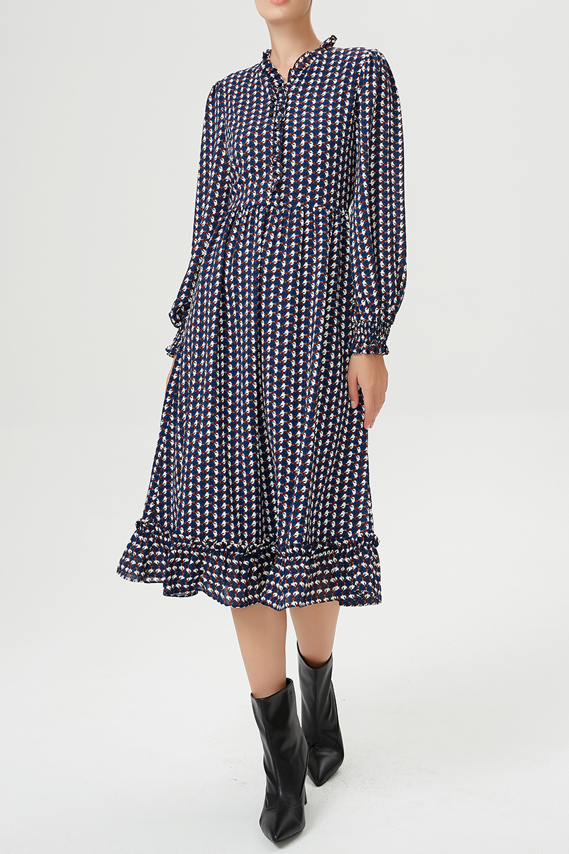 An piece effortless item thanks to its loose cut on the sleeves and its generous volume. Delicately underlines the silhouette through its fitted waist and wrists. Discreet V-neck decorated with small ruffles. A refine and versatile dress to wear without moderation during your city walks as well as your office days. Can be worn with boots, ankle boots, stilettos or sneakers according to your mood.