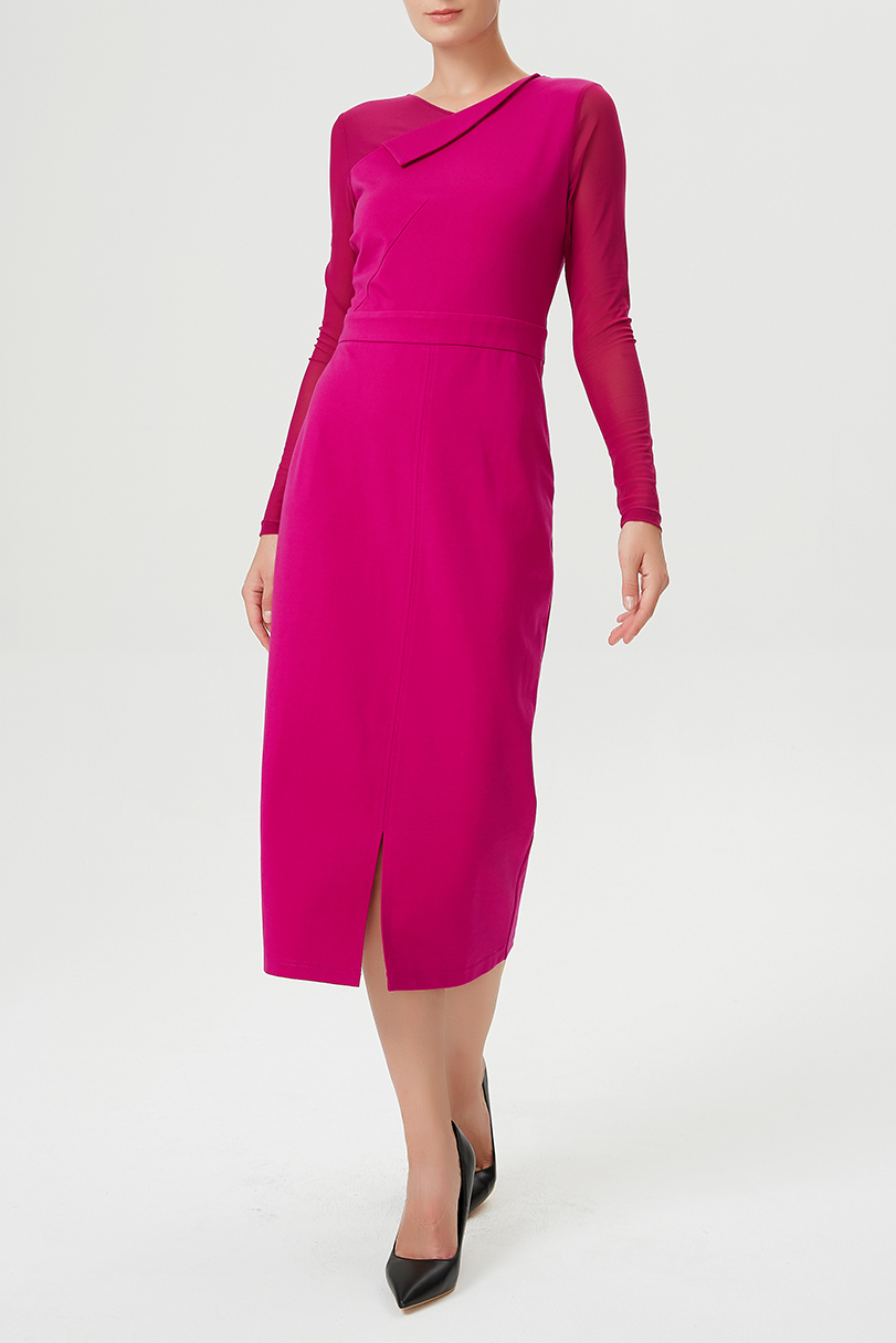 An elegant cut with an asymmetrical V-neck with lapel. This dress features a slightly transparent stretch mesh on the right shoulder and arms and a thick Milano jersey on the dress body. Center slit in front, invisible zip on the back. A timeless and comfortable piece to wear especially in the evenings and for chic occasions.