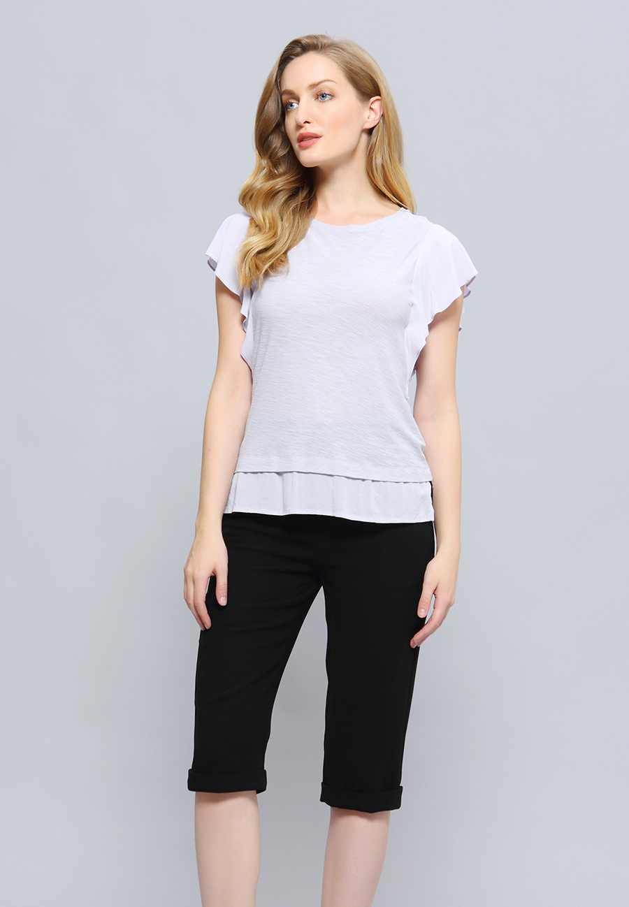 Featuring a stretch breathy jersey, this piece is ideal for the hottest days of the summer. Clever cutting around the sleeves displaying wide ruffles and yet a tight and decent fitting. Enhanced with a double frill panel on the bottom. An easy to wear piece to fit with many different skirts and pants, like for example our Minimalist Capri Pants.