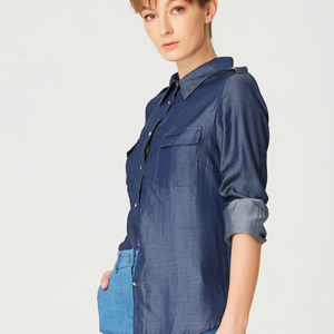 A shirt cut in a soft, supple and breathable Tencel fabric, reminding denim appearance. Two blue colors options. A classic and timeless fit featuring two flap-patch pockets, shoulder straps and metal buttons. Arrange in several ways according to your desires: buttoned up and tucked into the pants for a flawless and sophisticated style, or slightly open at the neckline and sleeves rolled up for casual getaways. Wear without moderation, at the office or in the evening.