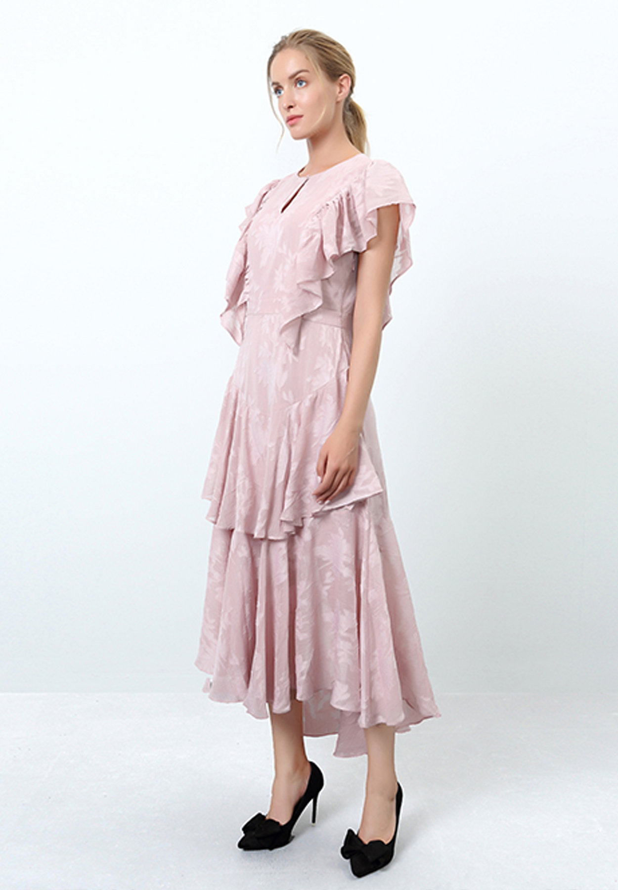 Cut in a refined veil featuring floral pattern dévorés, this dress gracefully highlights your figure; fitted waist, round neckline, generous volumes of frills over the skirt and wide ruffles along the shoulders down to the waist. A feminine and chic style, perfect for a fancy day or a romantic evening.