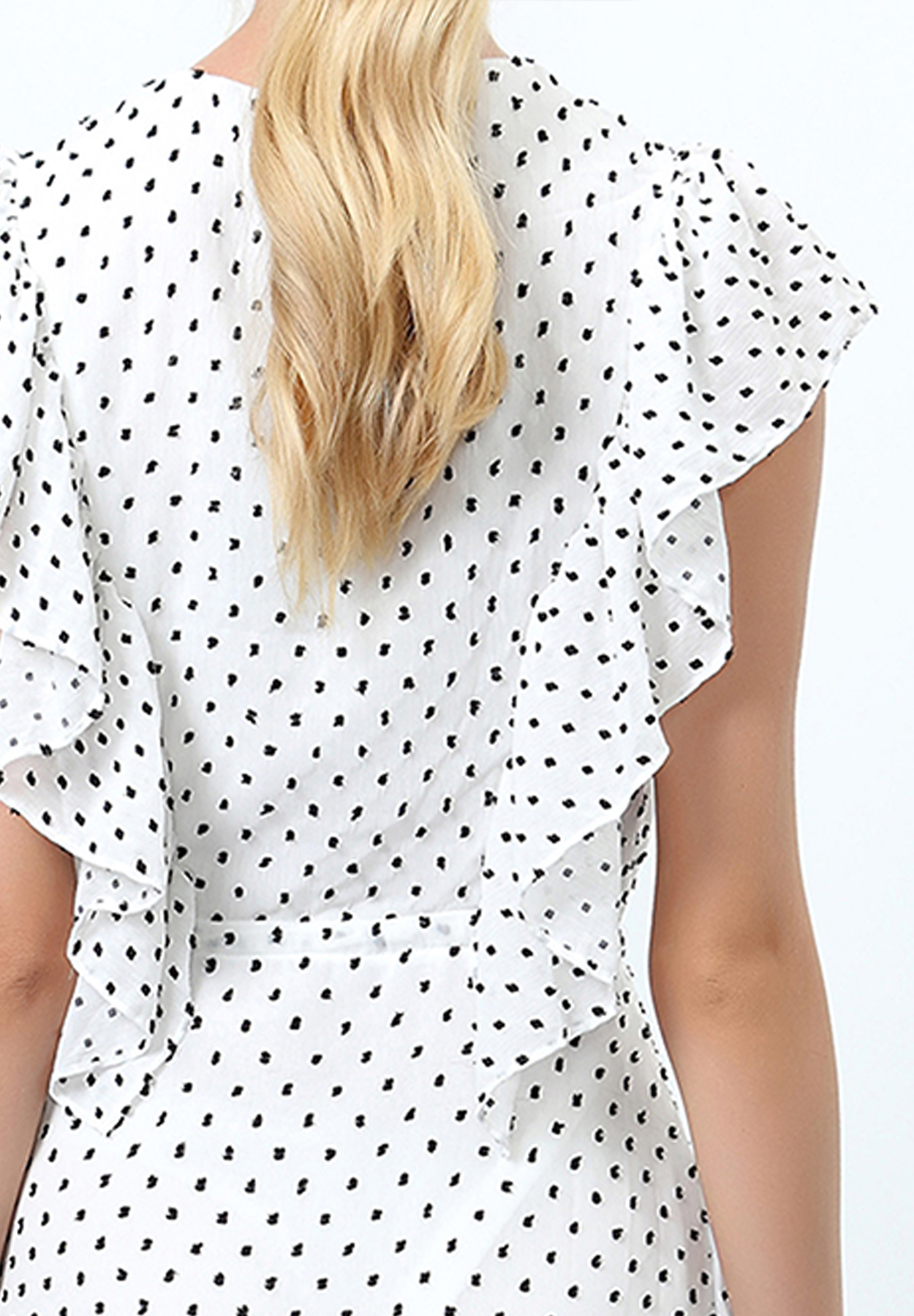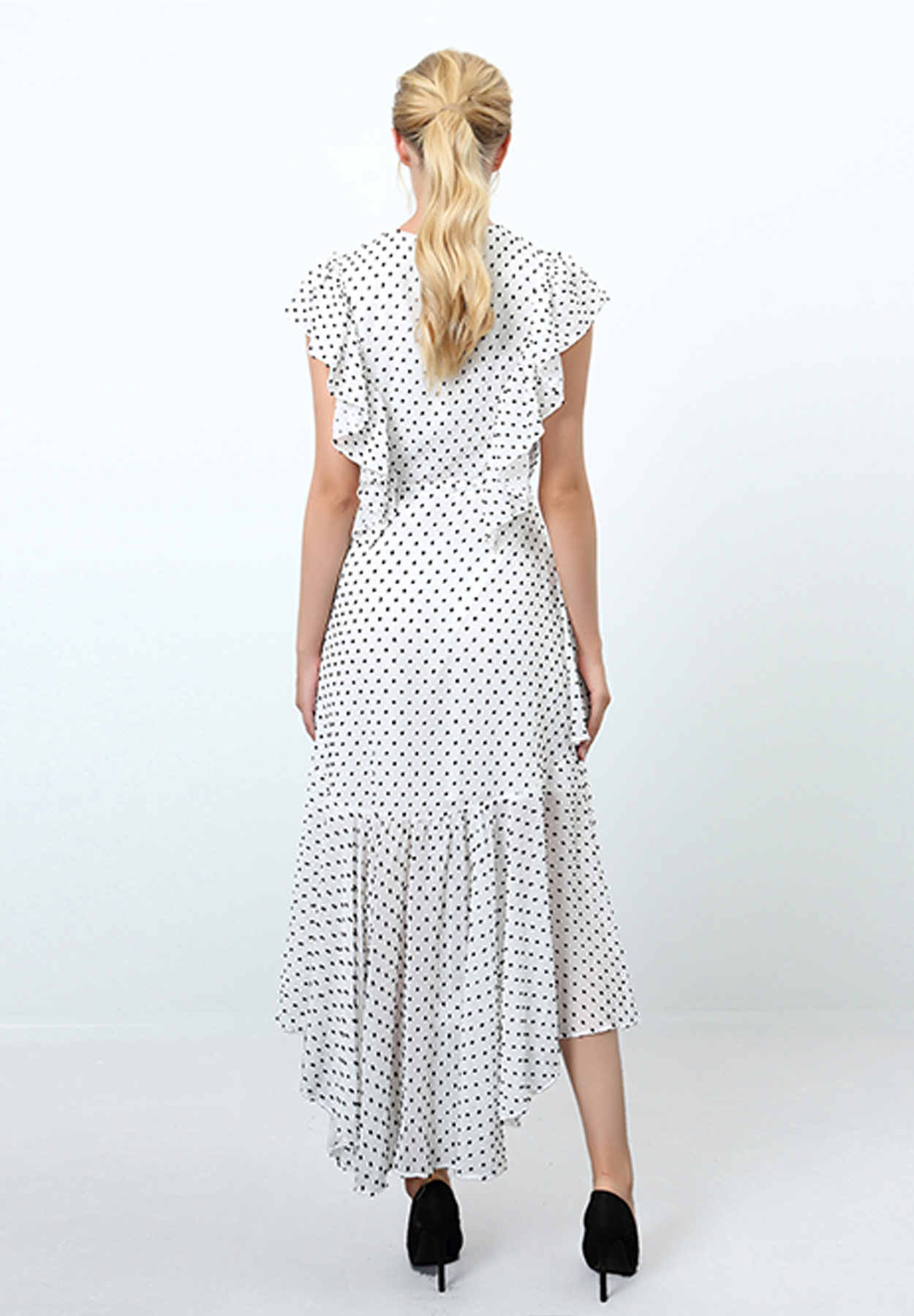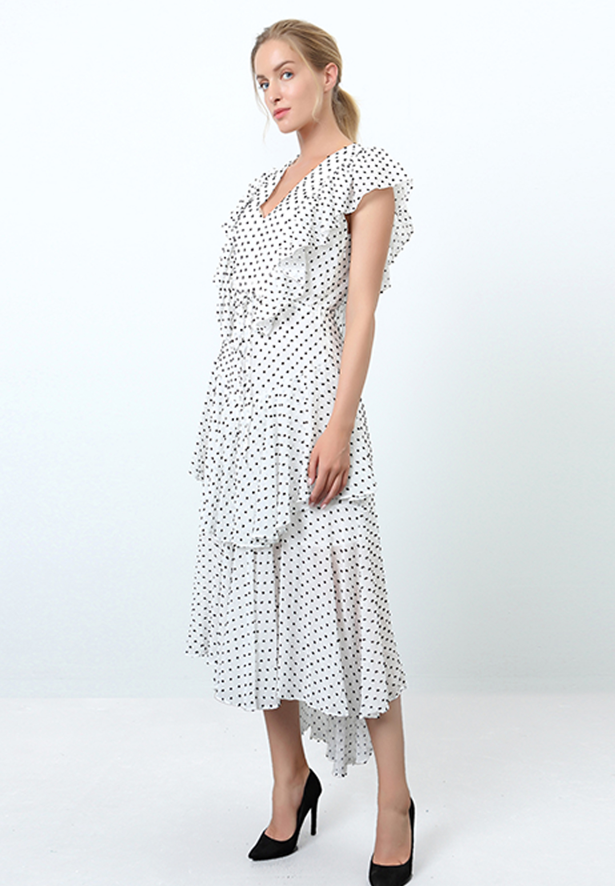 Featured in a refined polka dot print, this dress gracefully highlights your figure; fitted waist, V neckline, generous volumes of frills over the skirt and wide ruffles along the shoulders down to the waist. A feminine and chic style, perfect for a fancy day or a romantic evening.