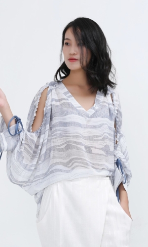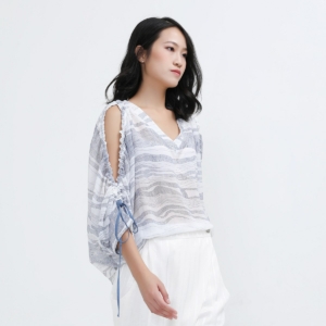 Blouse à col V et épaules dénudées en mousseline imprimé linéaire