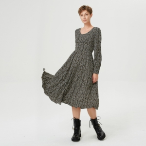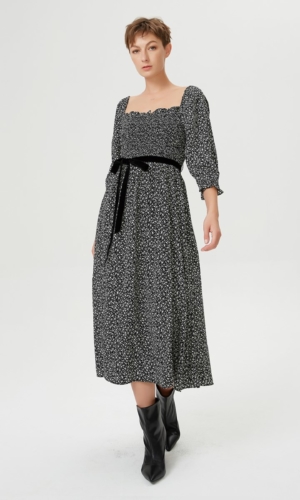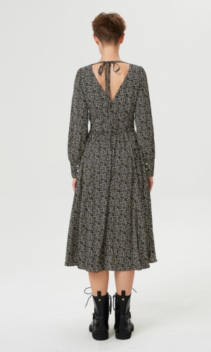 Robe-blouse ceintrée à imprimé liberty et encolure plongeante au dos