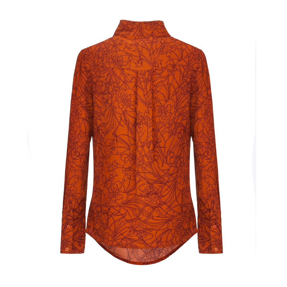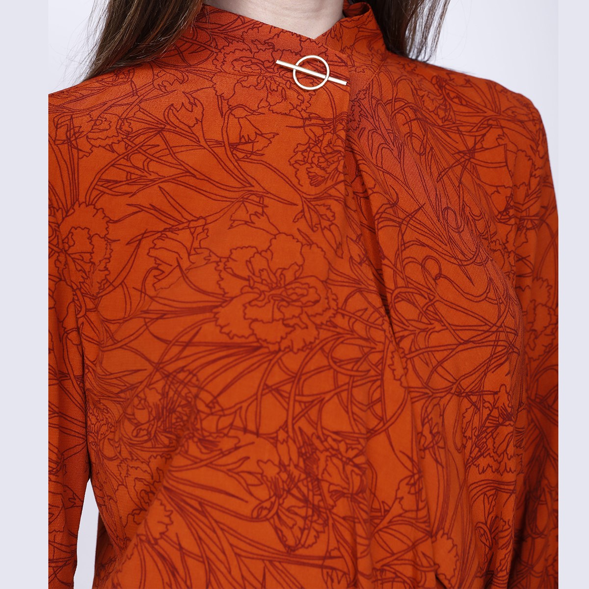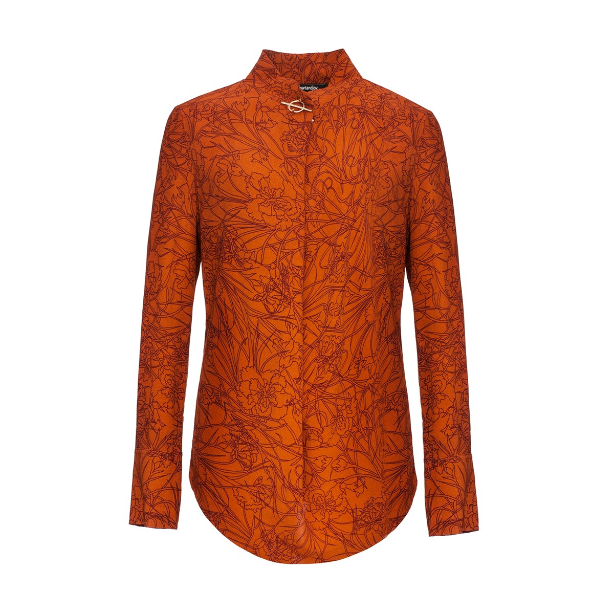 Une blouse originale dans un imprimé floral linéaire subtil et aux couleurs vibrantes, Col asymétrique montant orné d’un bouton métal doré. A porter avec un tailleur Noir ou Bordeaux au travail ou de facon plus détendue avec un jean.