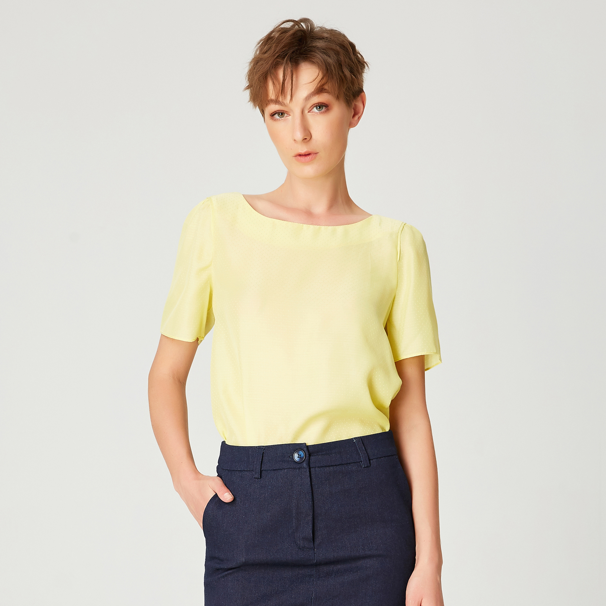Une pièce élégante et intemporelle, ce haut peut être accessoirisé avec toutes sortes de jupes ou pantalons, formels ou décontractés. Une valeur sûre dans n’importe quelle garde-robe coupée dans un tissu raffiné orné d’un léger plumetis.