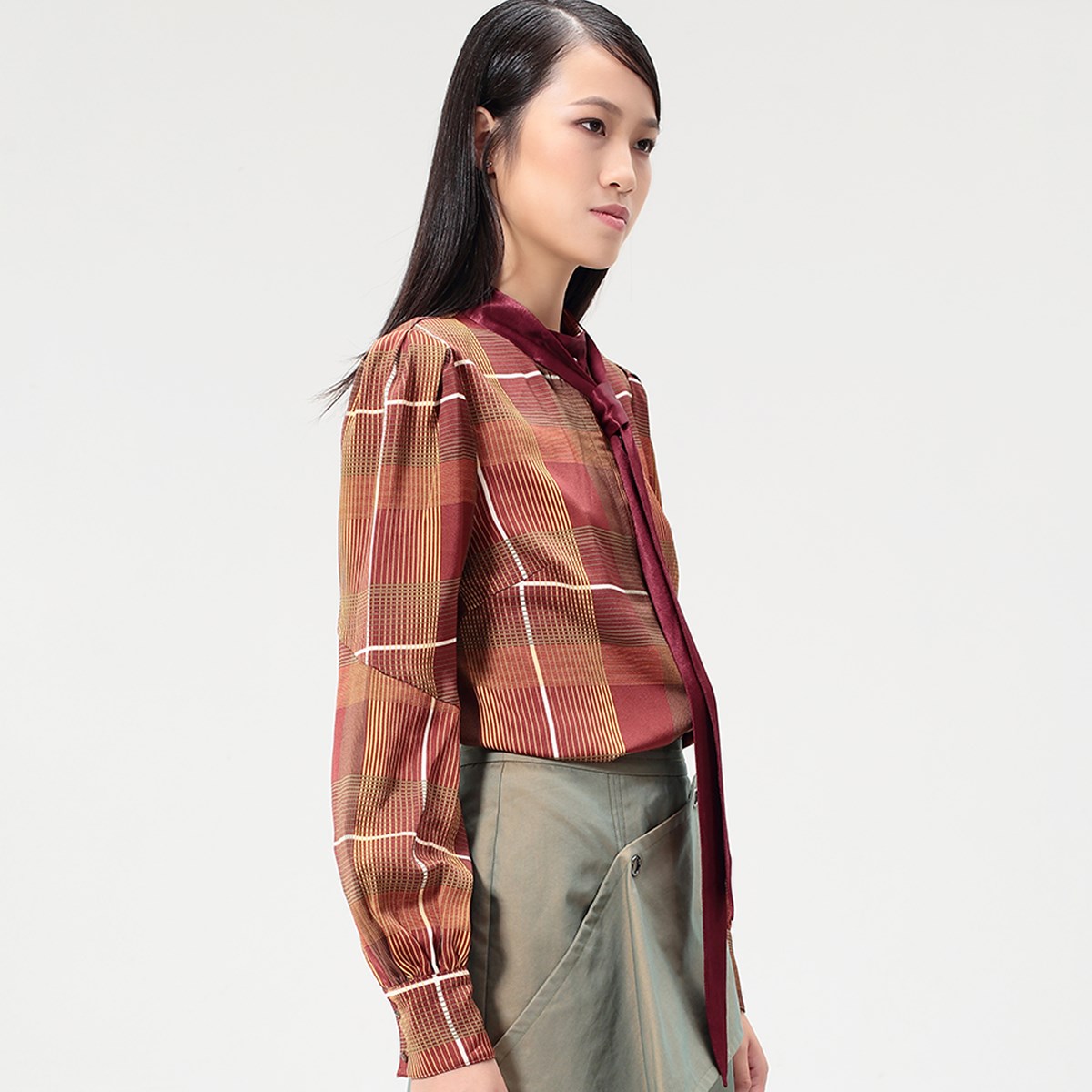 Un des succès de cette saison, l’imprimé tartan. SmartandJoy le décline dans des couleurs automnales et un motif plus large pour lui donner davantage de caractère. Le tissu de cette chemise est un crêpe de satin très léger et s’agrémente de petites parties unies aux bras et pour le col cravate. Une pièce chic qui dynamise un tailleur classique au travail ou donne un look sophistiqué en soirée.