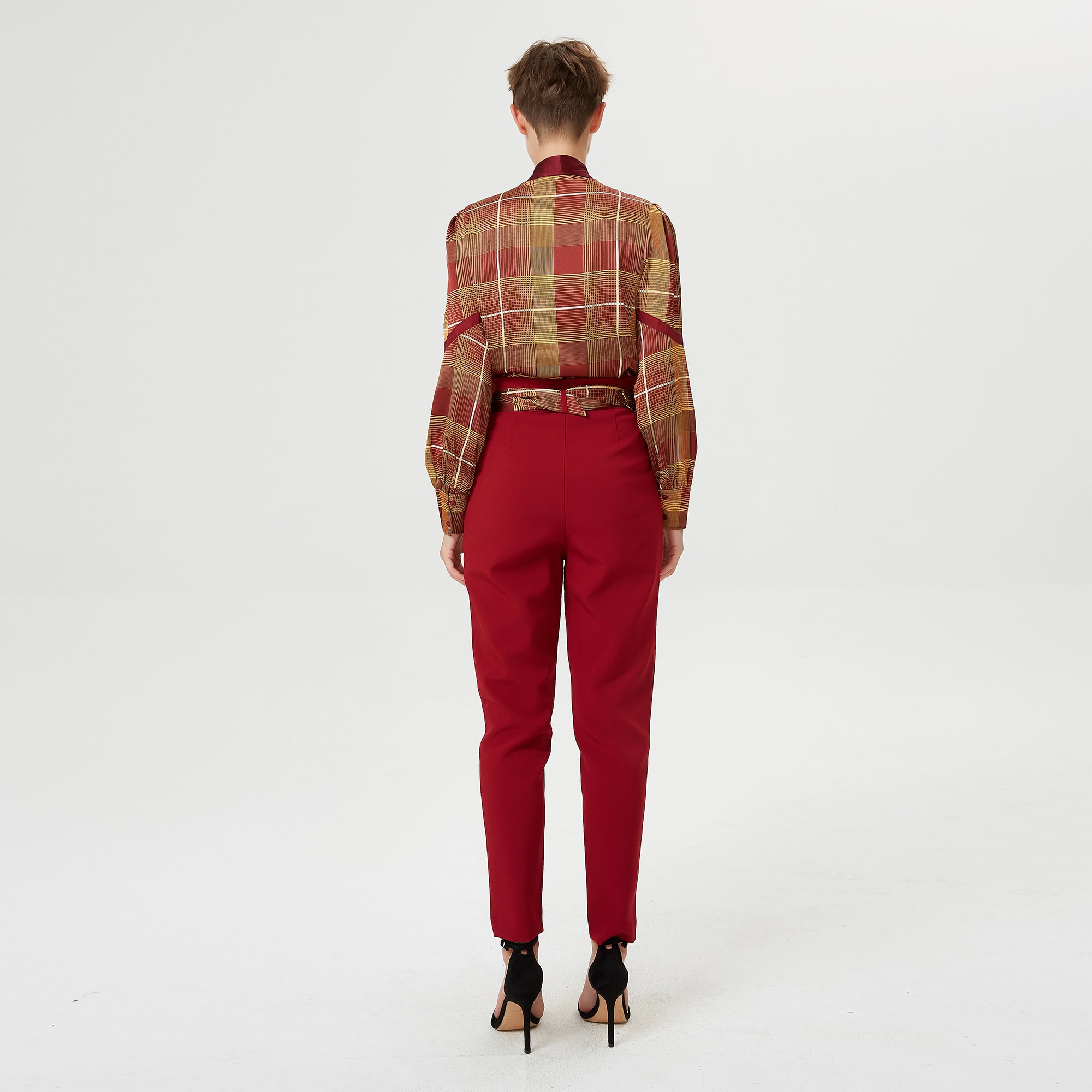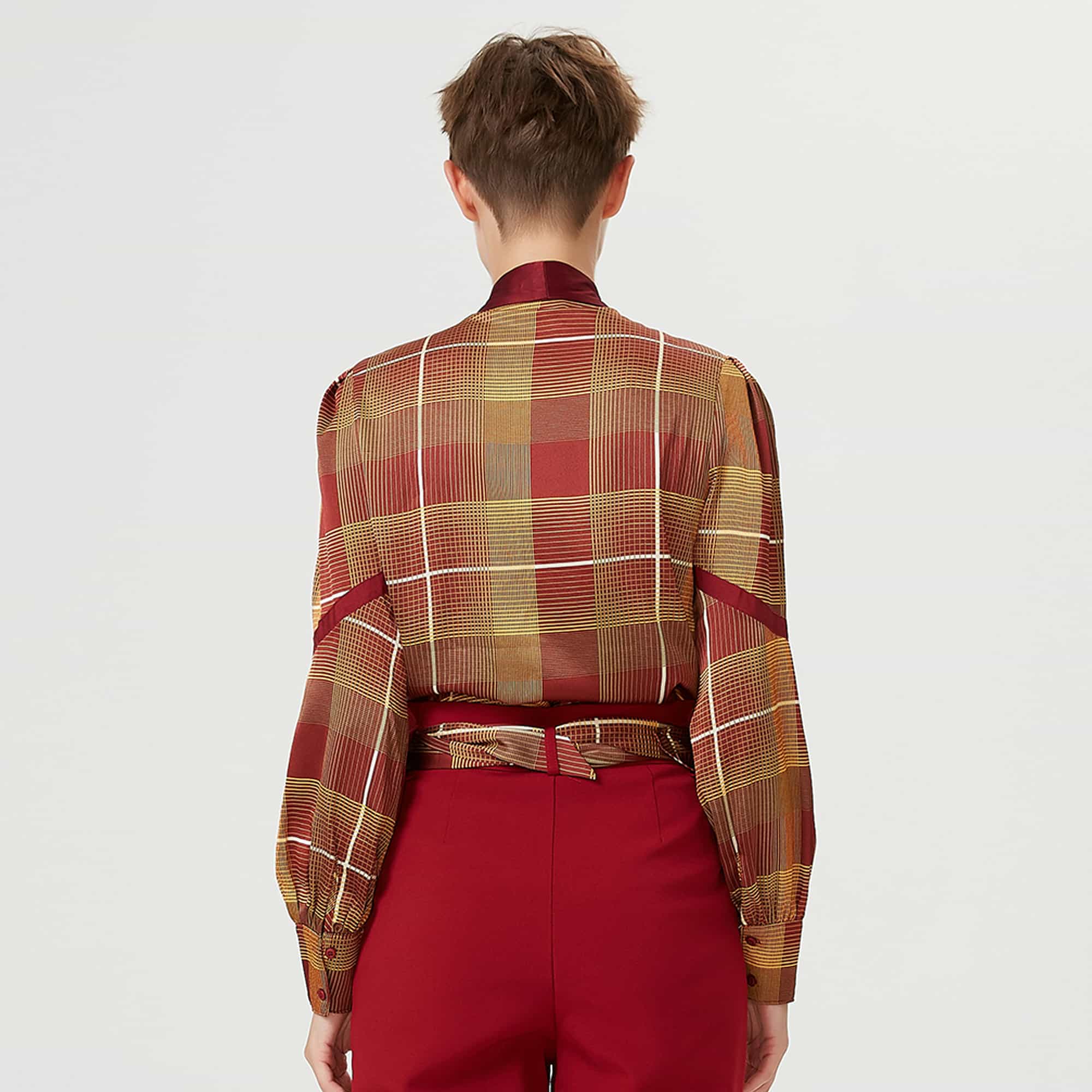 Un des succès de cette saison, l’imprimé tartan. SmartandJoy le décline dans des couleurs automnales et un motif plus large pour lui donner davantage de caractère. Le tissu de cette chemise est un crêpe de satin très léger et s’agrémente de petites parties unies aux bras et pour le col cravate. Une pièce chic qui dynamise un tailleur classique au travail ou donne un look sophistiqué en soirée.