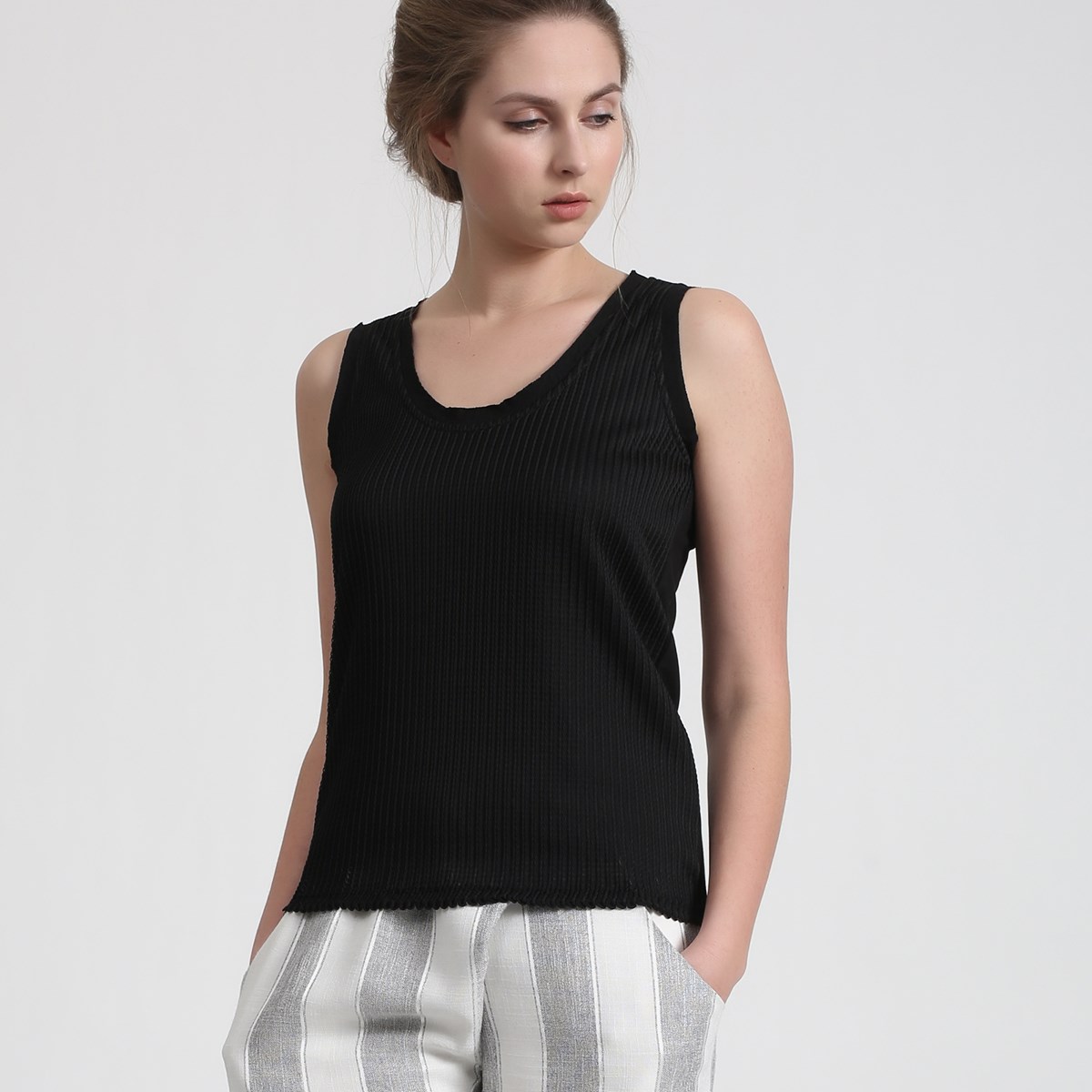 Une pièce de coupe simple et à finitions raffinées : encolure et emmanchures soulignées par un biais coton bord franc. Devant la matière est un tricot respirant et le dos présente dans un satin de viscose. Un débardeur qui s’associe à de nombreux styles ; jupes, pantalons, shorts…
