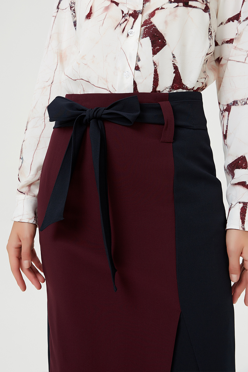 Cette jupe présente deux panneaux de couleurs différentes type portefeuille s’ouvrant sur une fente. Agrémentée d’une ceinture à nouer, elle est pièce qui attire l’attention et peut ainsi se porter avec un top très simple. Peut également s’associer à notre « Chemise droite à imprimé effet marbre » pour un look plus sophistiqué.