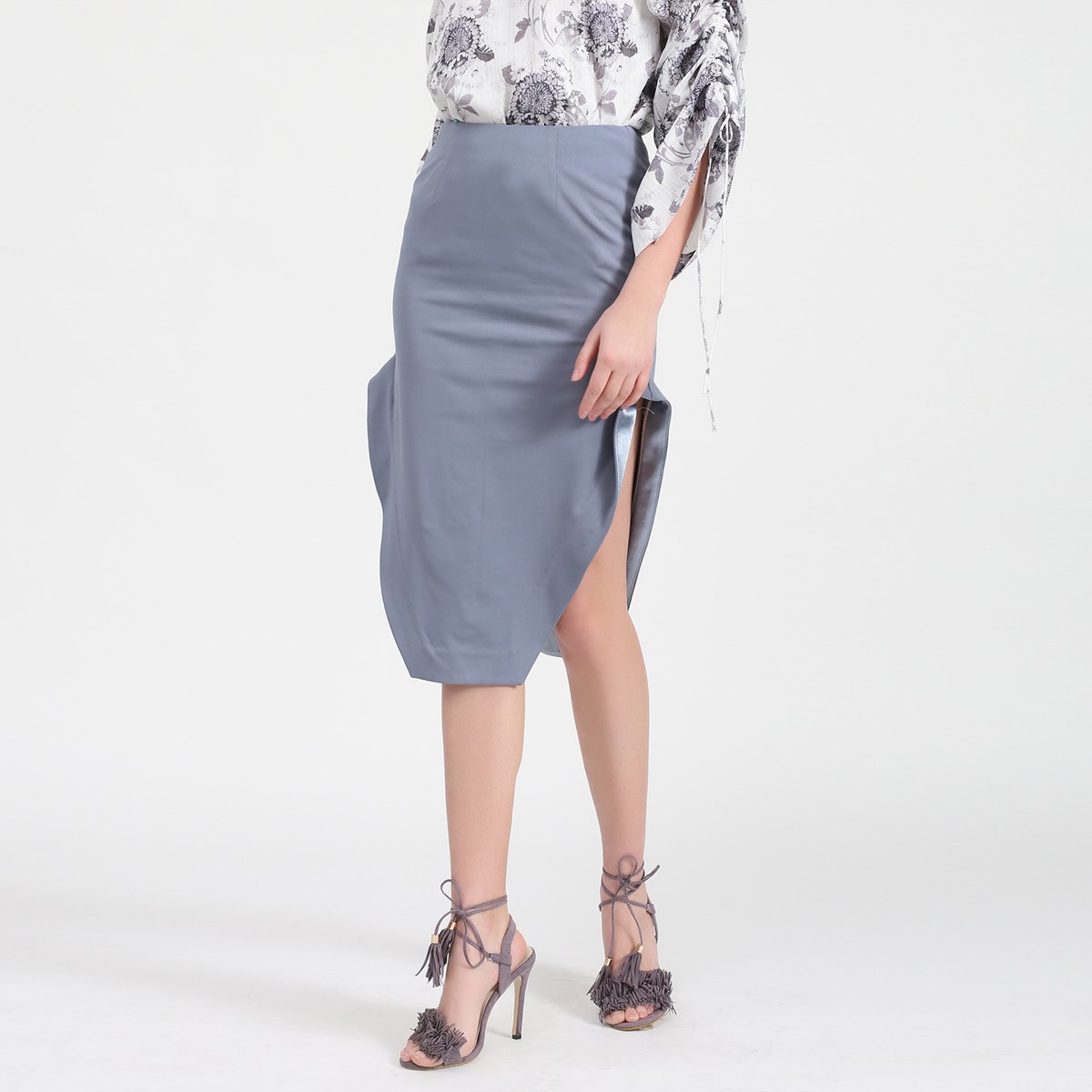 Une coupe séduisante de caractère, cette pièce propose des ouvertures aux cotés révélant subtilement les jambes. Finitions haut de gamme avec propretés satinées tout au long de l’ourlet fini par biais doré. A associer avec une chemise ou ne blouse pour un look sophistiqué.