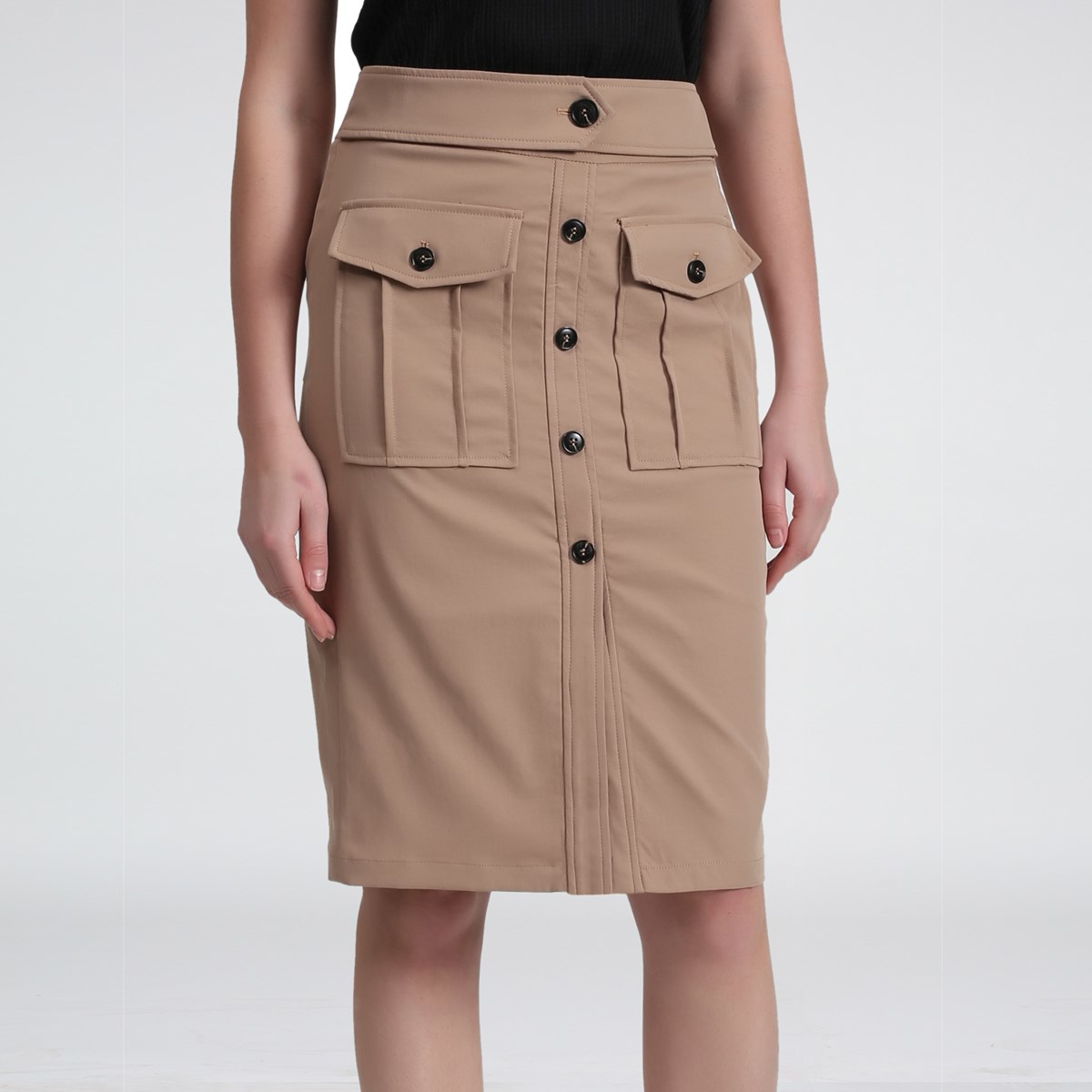 La jupe basique saharienne revue avec plusieurs détails : double ceinture sur le devant, larges poches style militaire, ouverture boutonnée milieu devant. Gabardine douce et stretch très confortable. Une pièce à la fois très actuelle et intemporelle qui sera parfaite avec notre « Veste saharienne épaules dénudées » ou une simple chemise de coton blanche.
