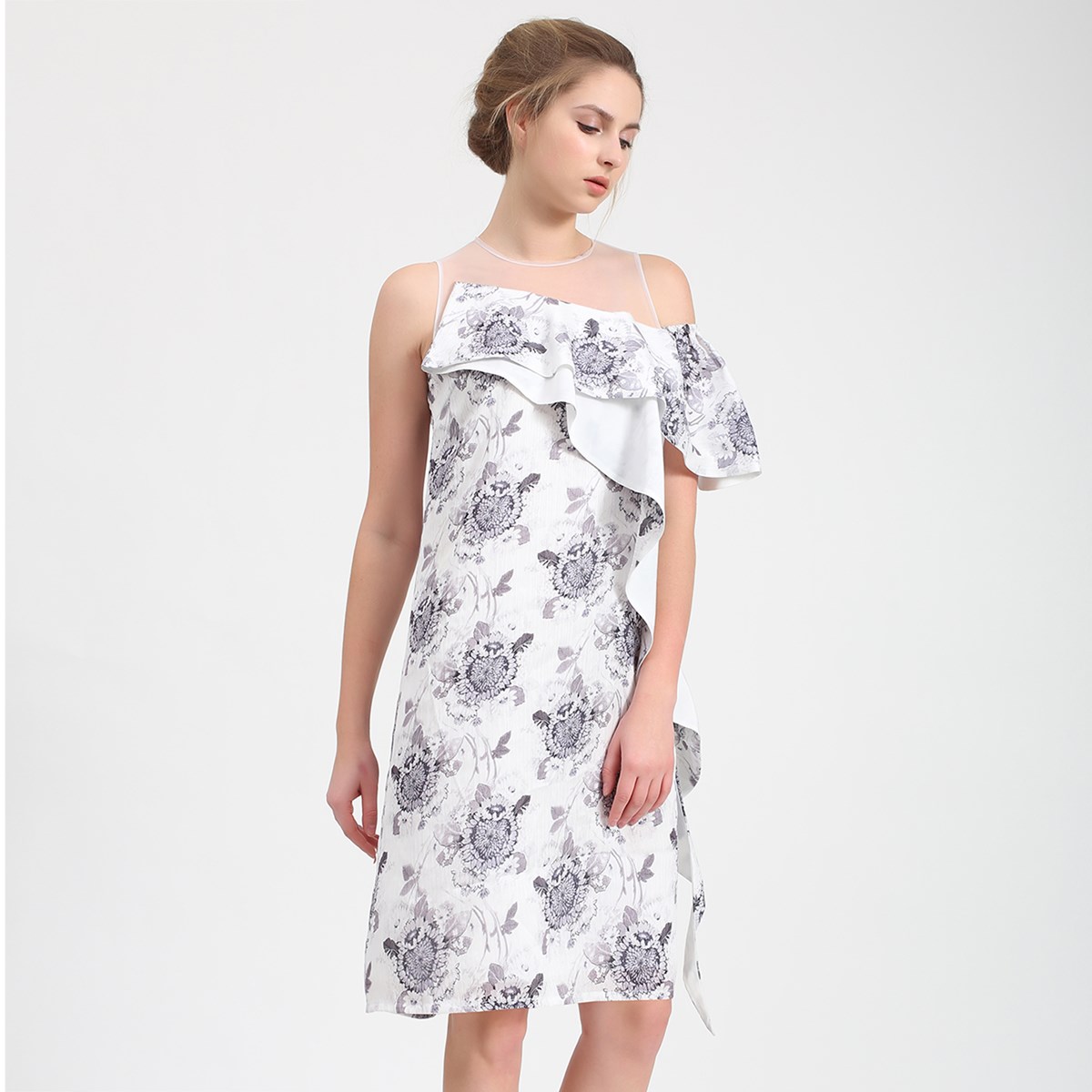 Une base de coupe simple légèrement ligne-A, ornée d’un large double volant parcourant le buste et le côté gauche pour finir dans le dos. Le tout soutenu aux épaules par un tulle léger fini par un bais aux emmanchures et à l’encolure. Une pièce sculpturale et féminine qui convient pour votre prochaine « garden-party » ou mariage. Détails produit
