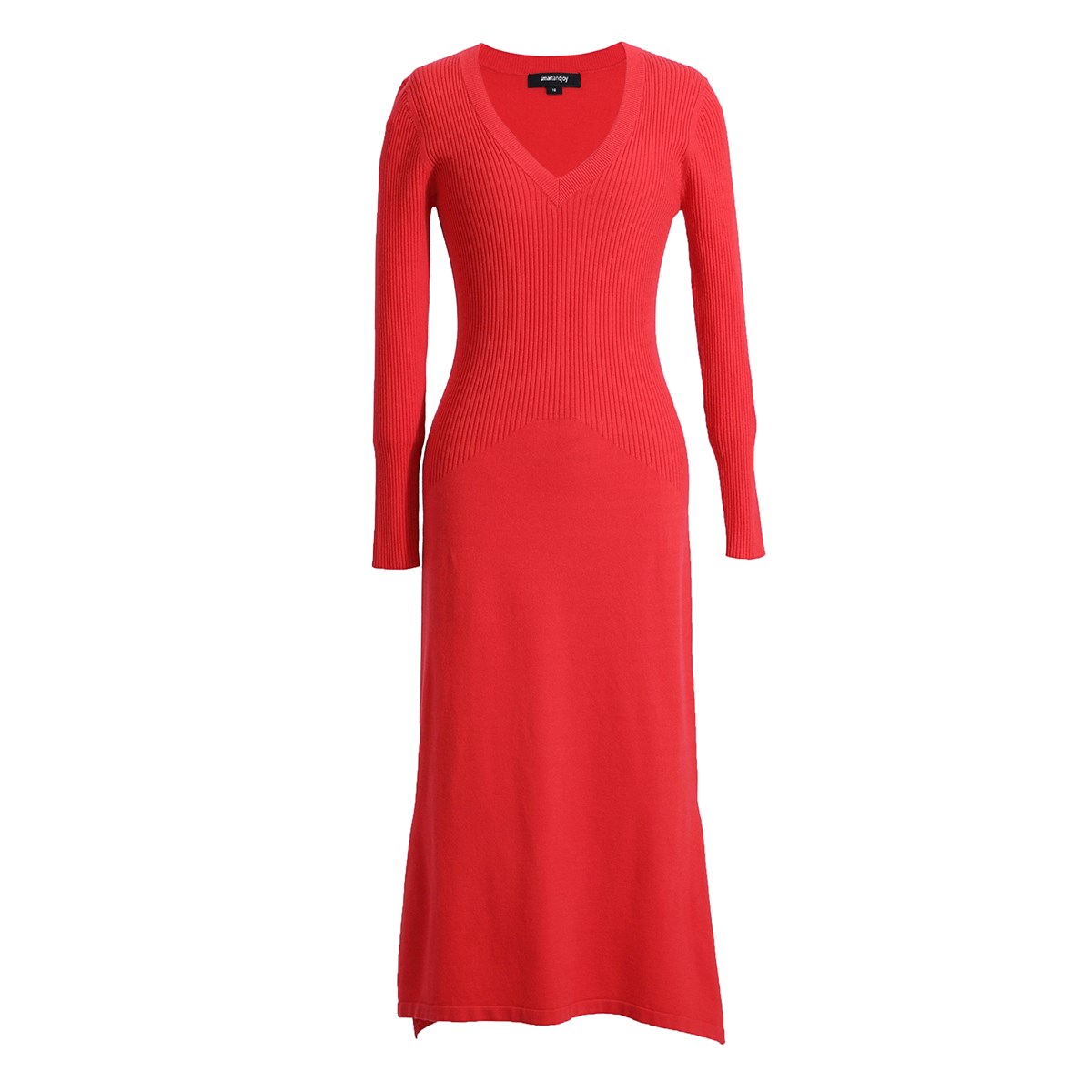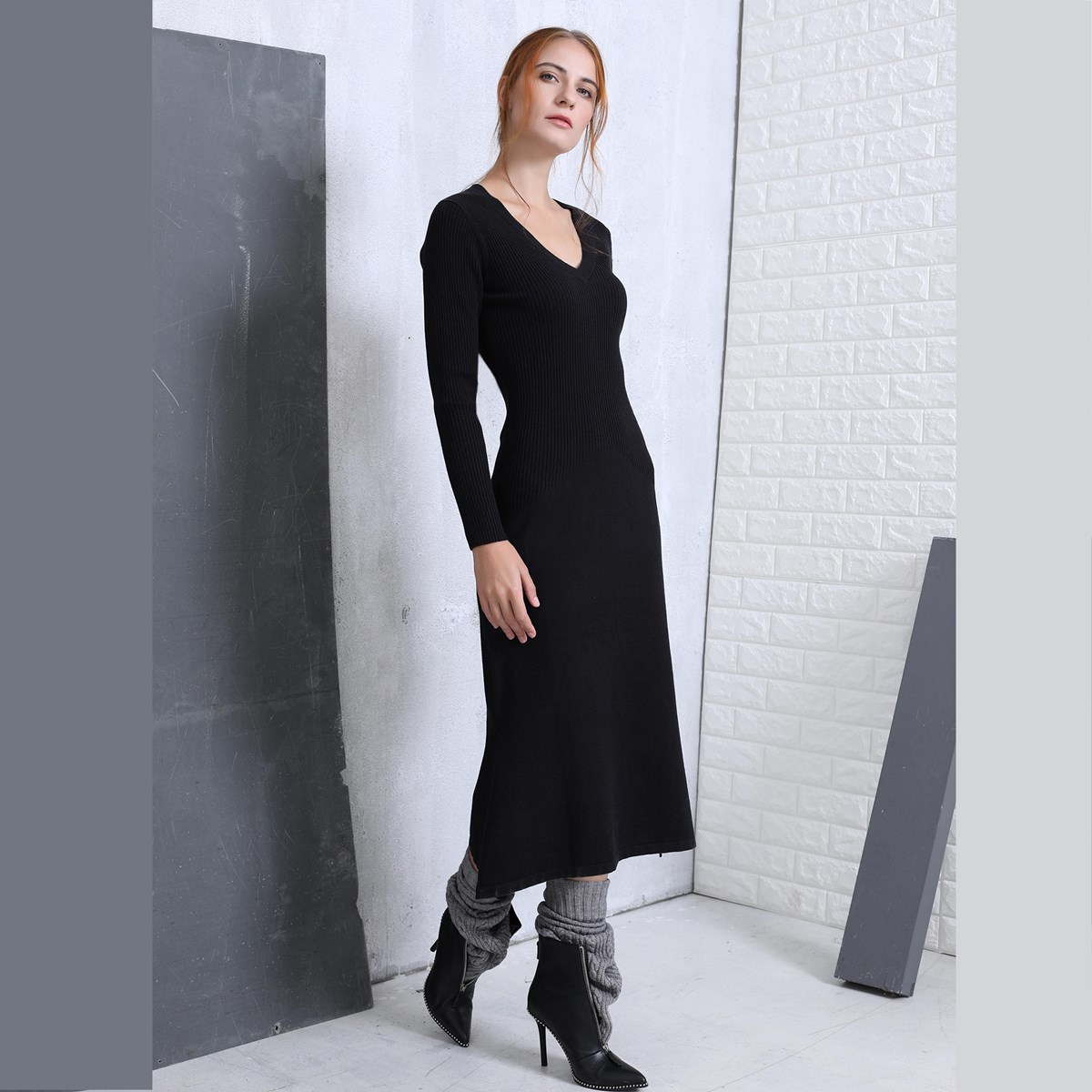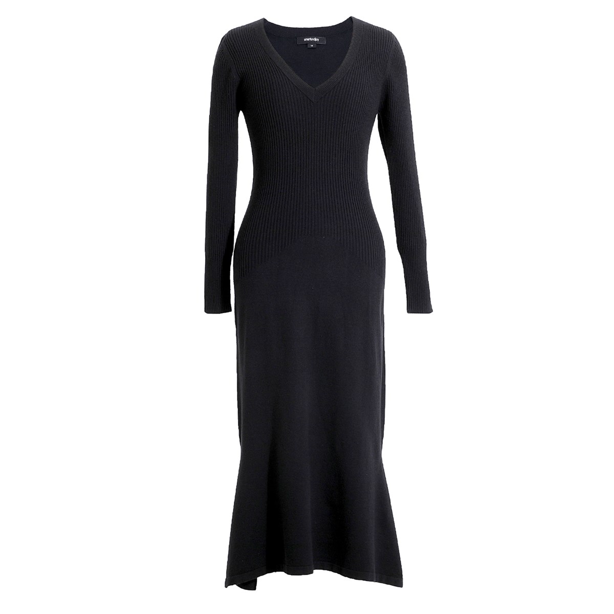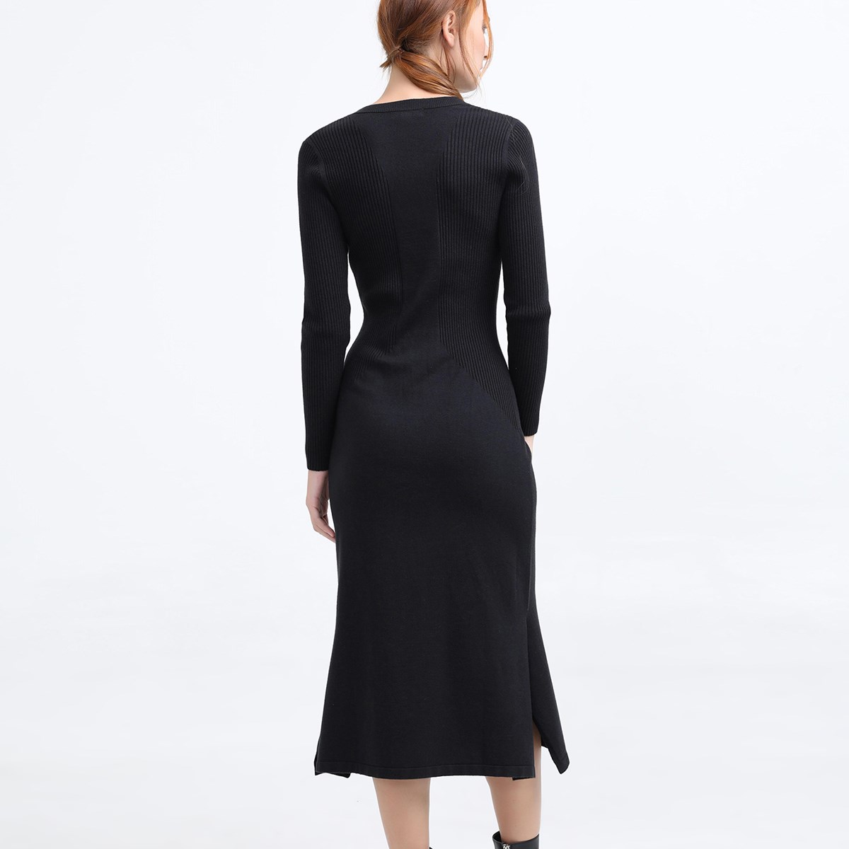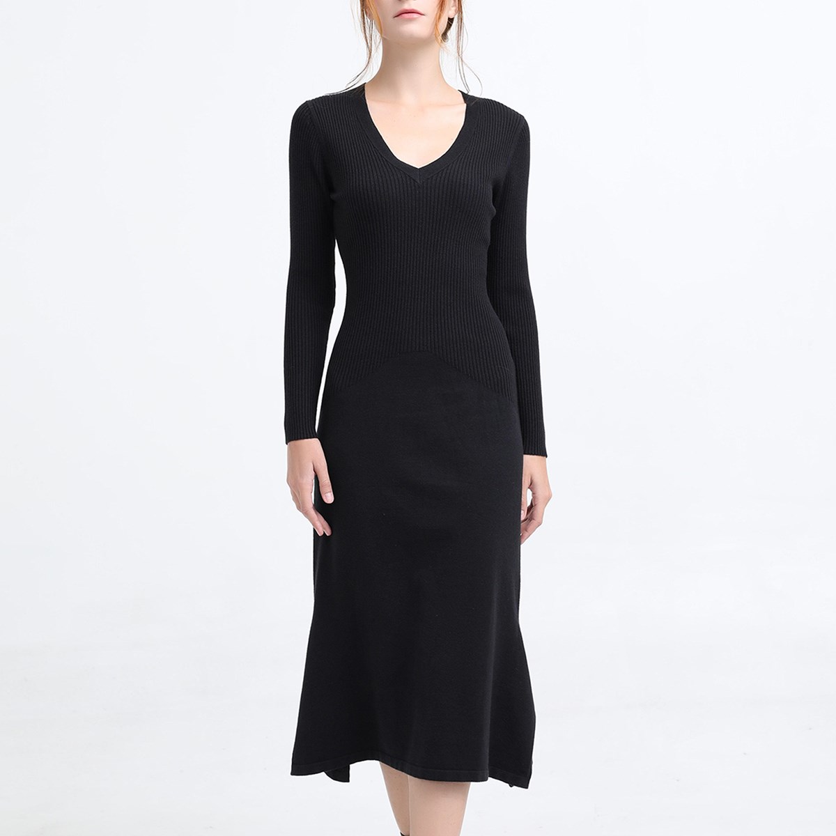 Une pièce intemporelle et passe-partout, convenant à la fois à des physiques longilignes ou pulpeux, Cette robe-pull est présente une maille douce, plus gainante à la taille et aux hanches grâce à une structure bord-cote. Manches longues, décolleté V, au bas de jupe : volume évasé et fendu aux cotés.