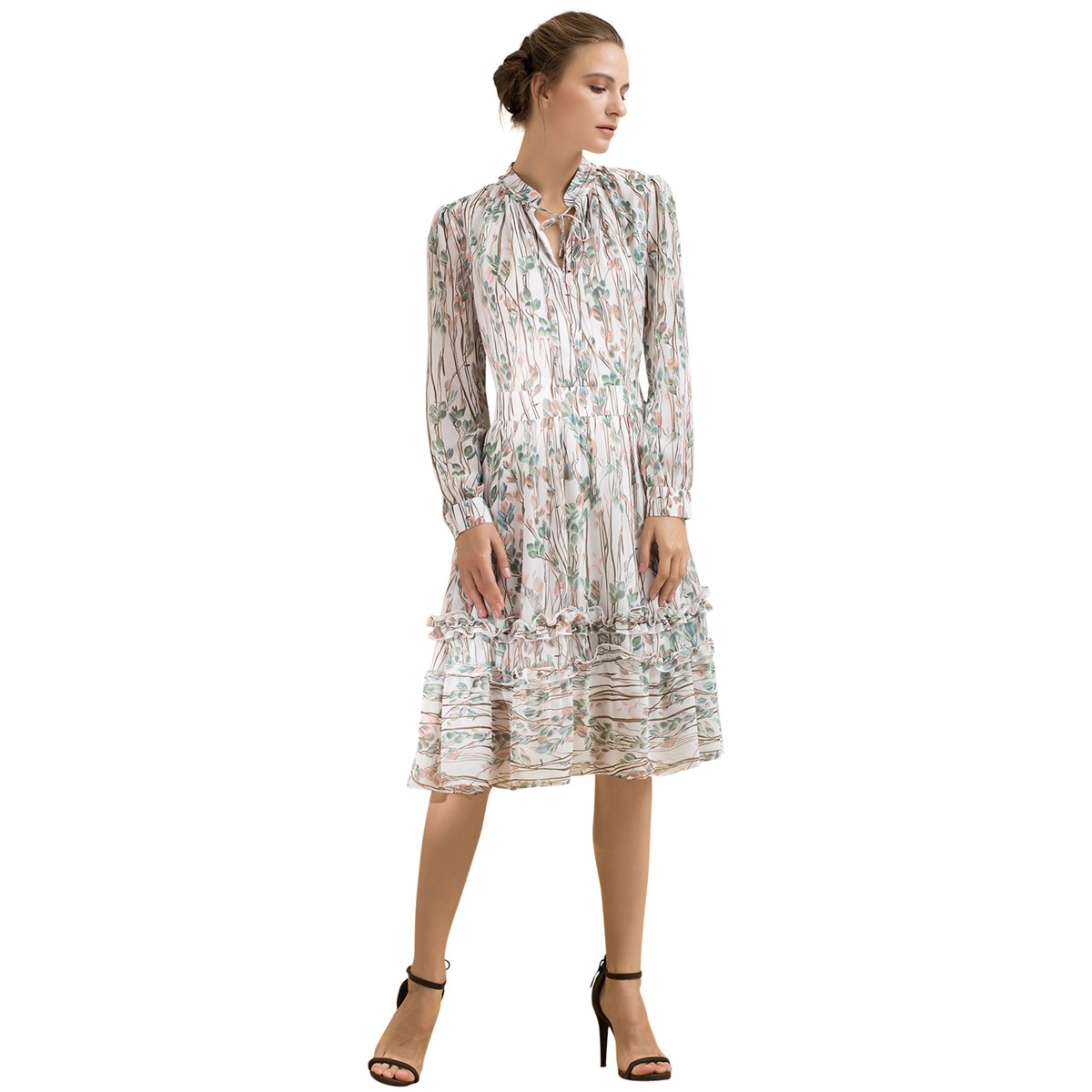 Coupe dans un voile raffiné et infroissable au motif végétal, cette robe présente une coupe flatteuse pour toutes les silhouettes. Cintrée a la taille, généreusement évasée et couvrant les genoux, agrémentée de petit volants. Une coupe intemporelle, pour une ligne élégante et féminine au bureau comme en soirée. Détails produit