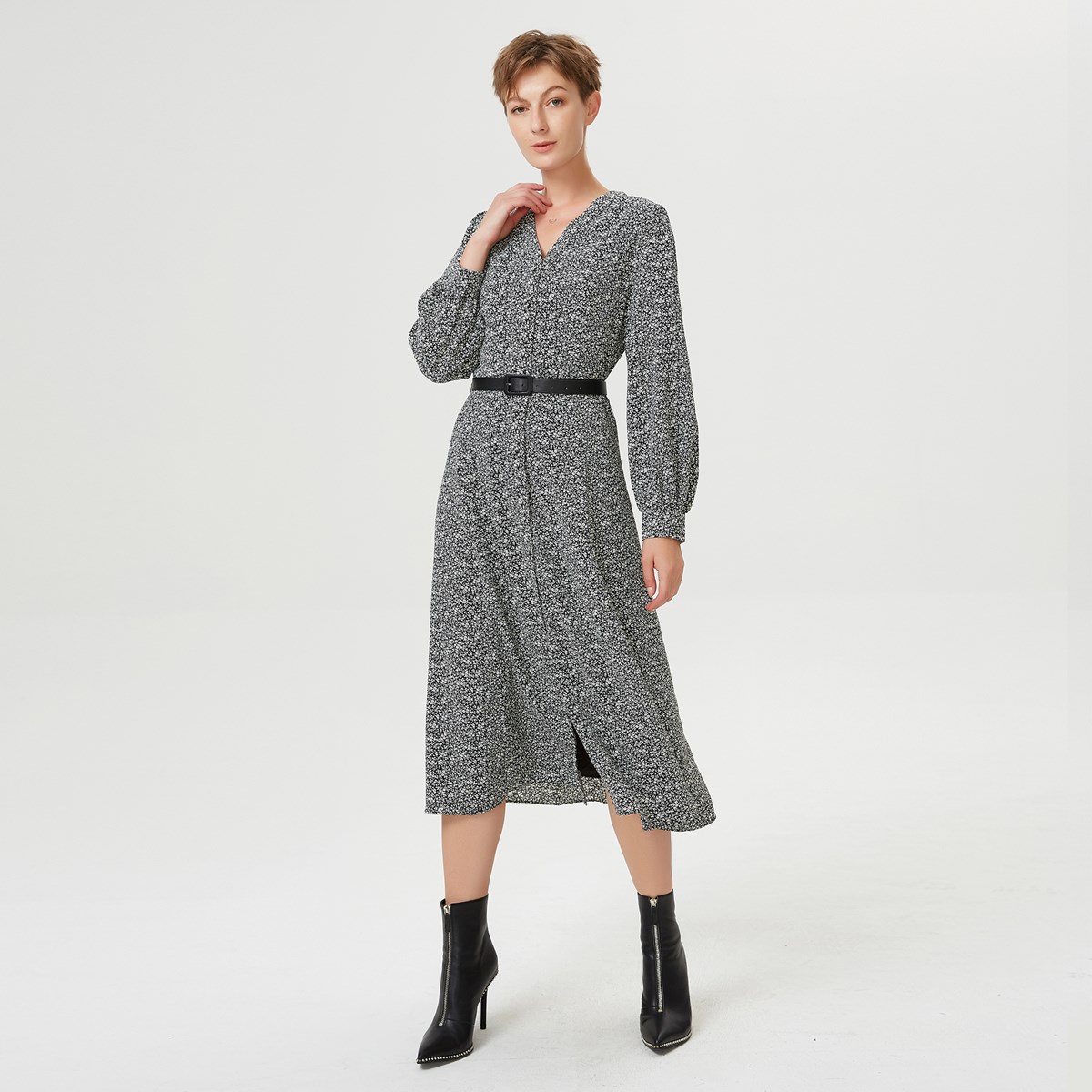 Une pièce à l’allure à la fois élégante et décontractée, cette robe s’agrémente d’un imprimé raffiné aux petits motifs floraux discrets. Encolure V, manches longues boutonnées aux poignets, cintrage de la taille et large volume de jupe évasé. Une coupe à l’allure un rien rétro qui adopte un style « baroudeuse » si associée à des bottines et une veste cuir perfecto ou qui offre un look romantique avec ballerines ou stilettos.