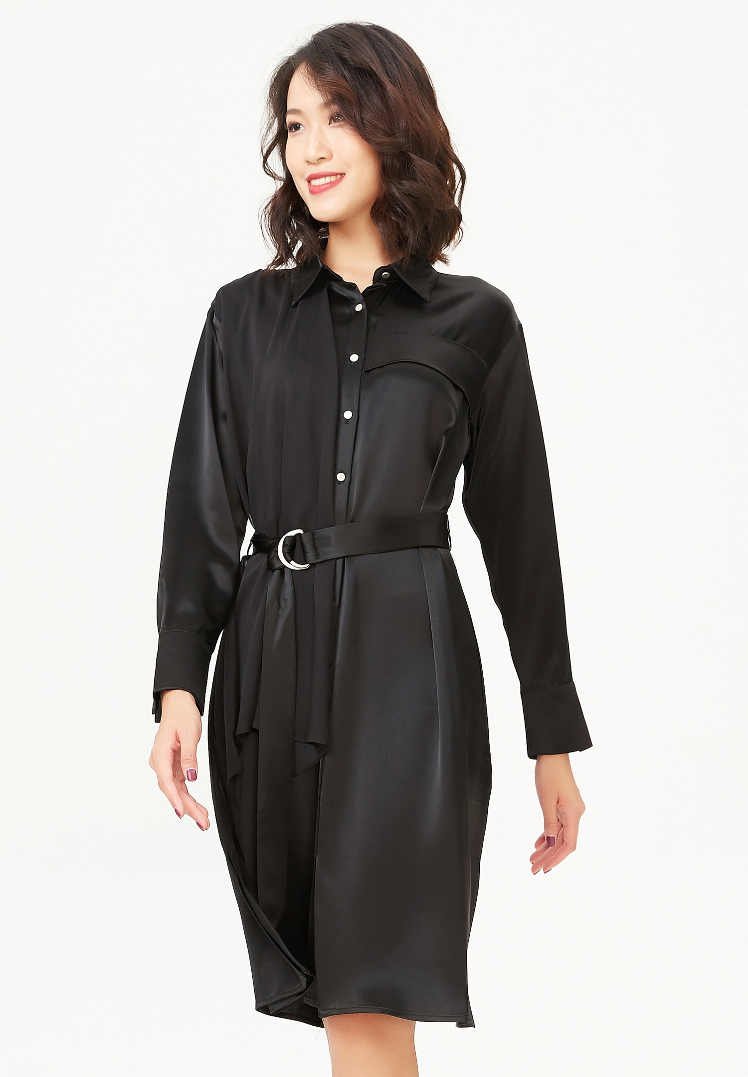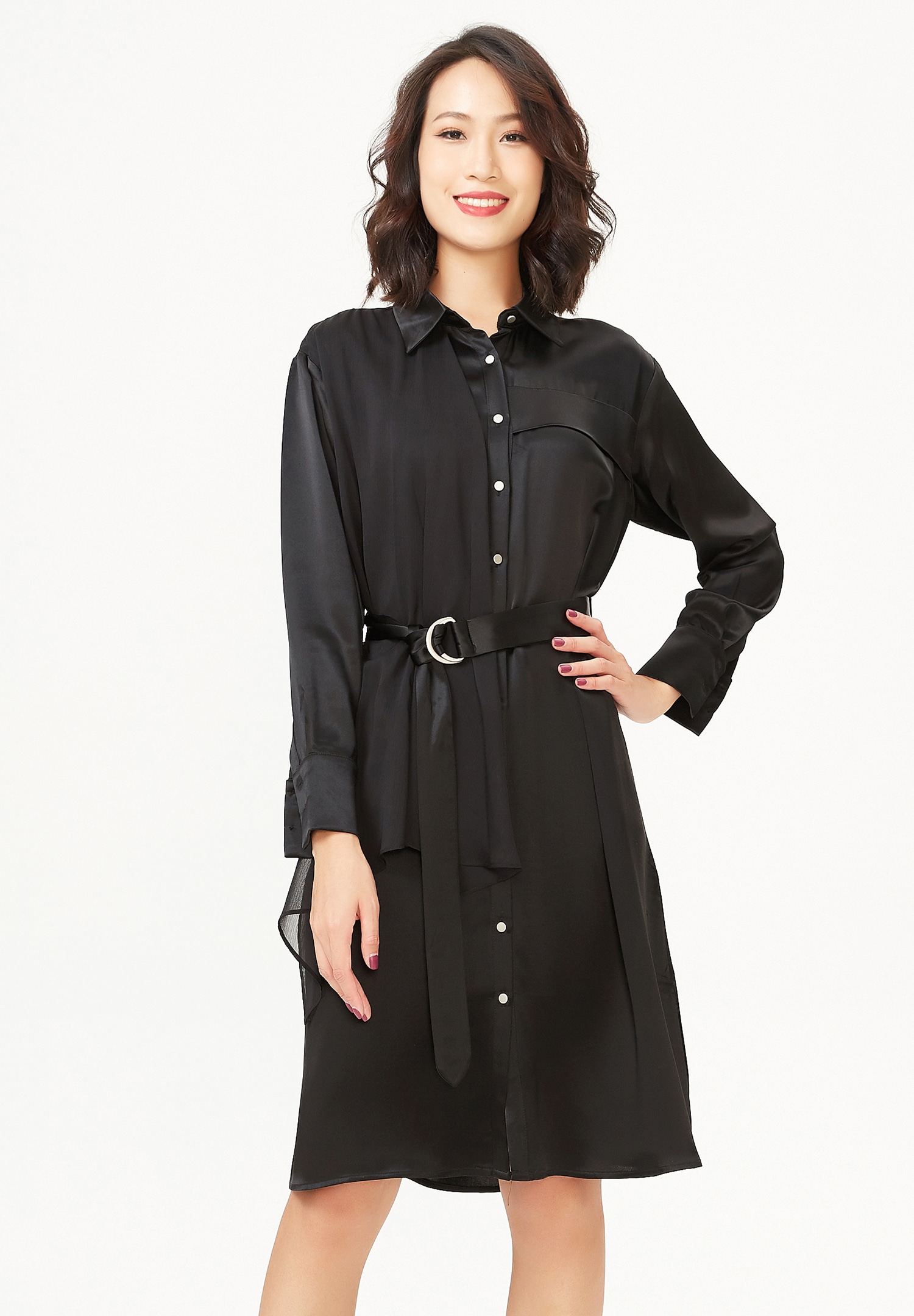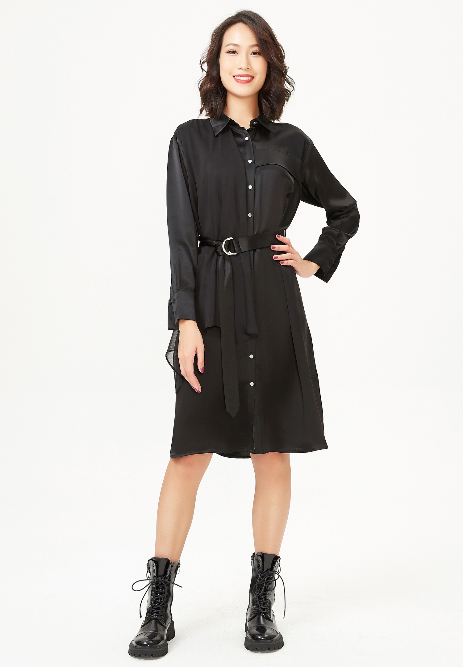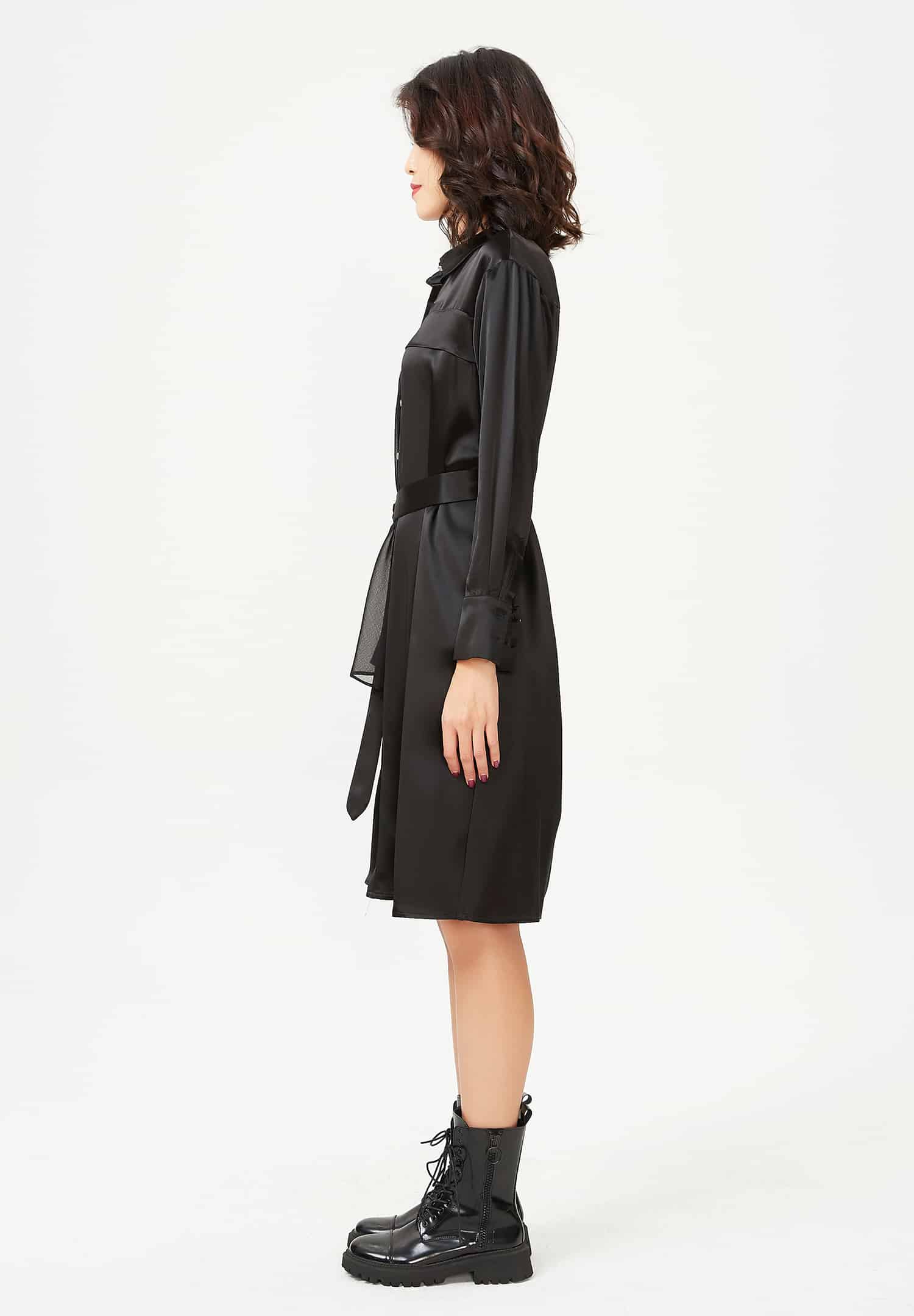 Un article de caractère mélangeant avec audace mousseline et crêpe de satin. Cette robe-chemise offre une coupe originale et structurée : sur une coupe droite classique viennent s’ajouter différents éléments : panneau mousseline sur côté droit, rabat sur poitrine gauche, ceinture ajoutée pour souligner la taille. Une pièce qui flatte la silhouette tout en la modernisant. Associez-la à des stilettos pour la féminiser ou jouez le côté nonchalant avec des rangers ou des bottes.
