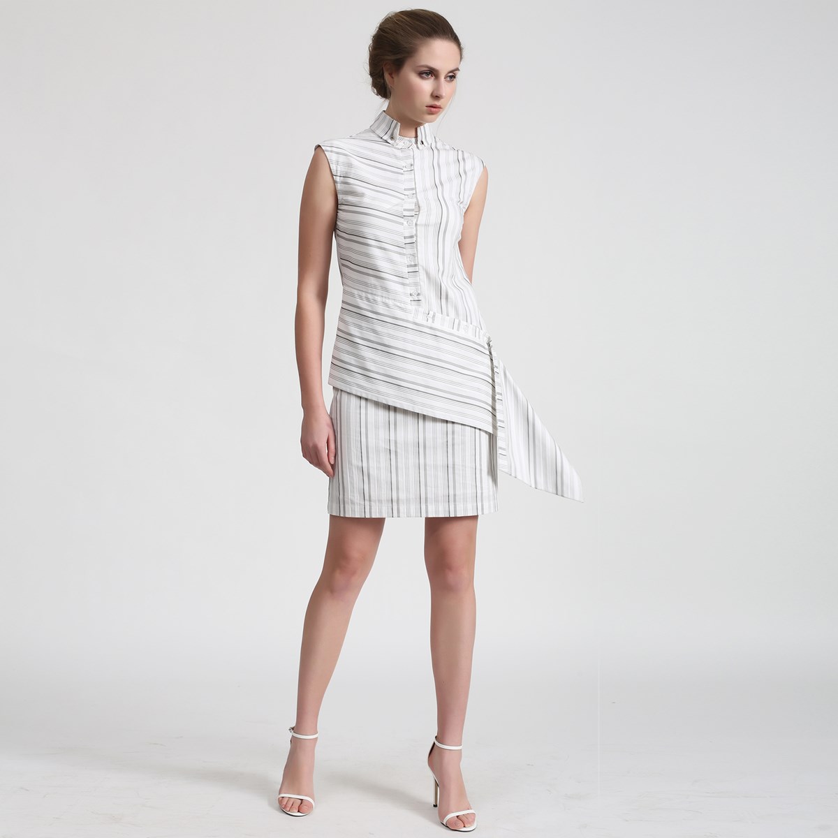 Une pièce très atypique et signée des studios S&J, cette robe-chemise présente une coupe dynamique jouant sur les lignes de construction et les directions du motif rayé. Large panneau transversal partant de la hanche et manches longues fixées par des boutons aux emmanchures. Coton stretch à rayures, très confortable et agréable pour l’été. Peut se porter seul comme une robe ou comme une tunique avec une paire de leggins ou un jean.