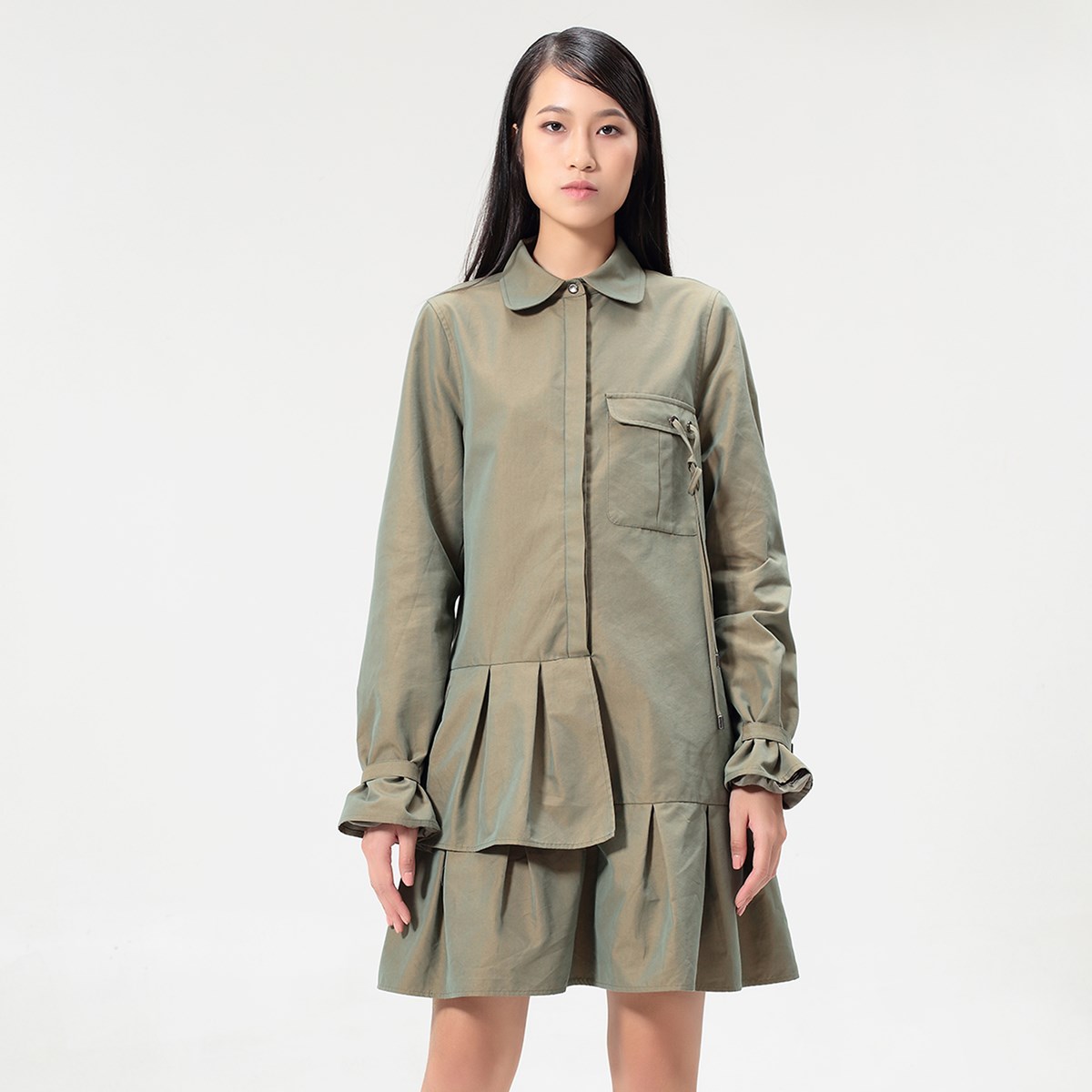 Impossible de se tromper avec cette robe chemise à l’allure androgyne : le style «voyage-safari » est clairement dans la tendance de la saison. Une allure décontractée et structure avec deux niveaux de volants plissés qui garnissent le bas de la pièce. Manches longues aux poignets resserrables, col claudine, poche soufflée poitrine gauche, le tout dans une toile de poly-coton à l’effet légèrement irisé. A porter avec des bottes courtes pour un allure aventurière!