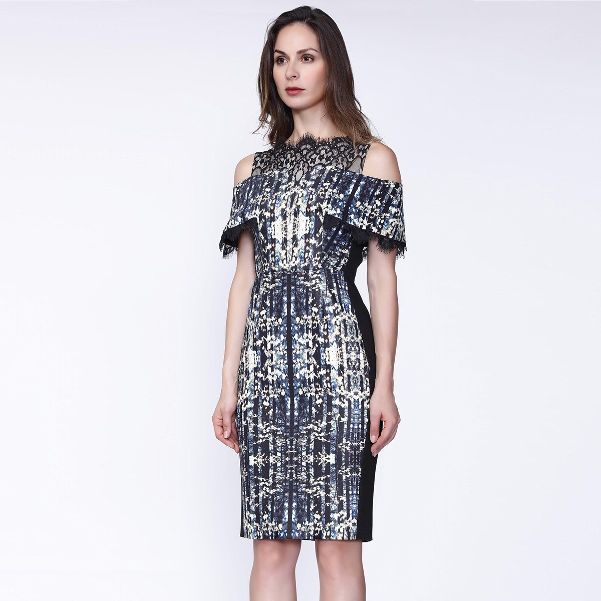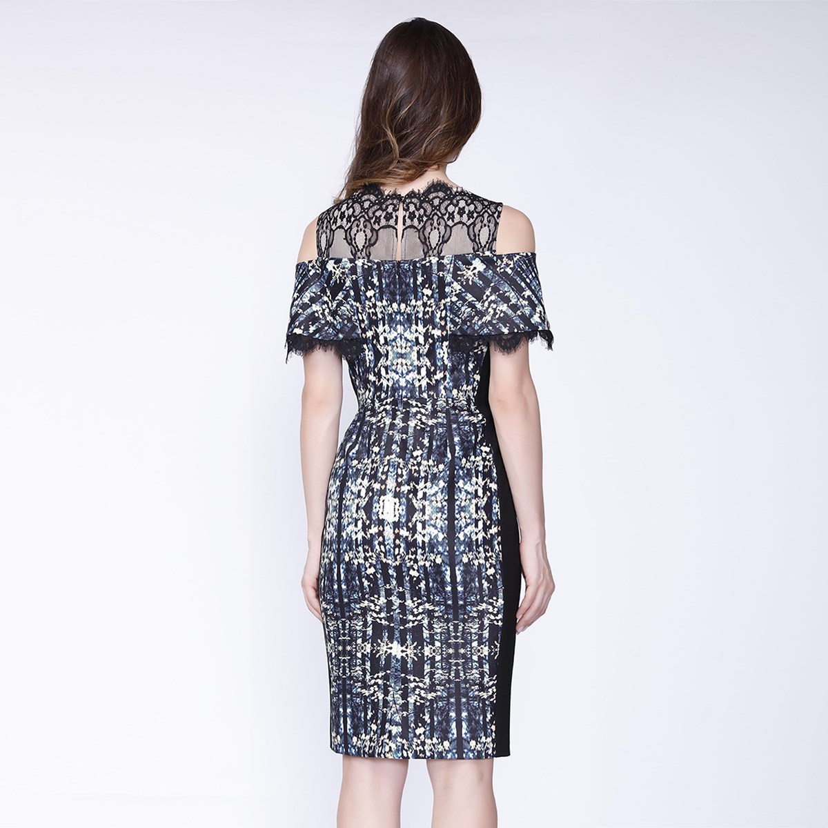 Robe cocktail courte imprimée, à décolleté bardot et garniture de dentelle