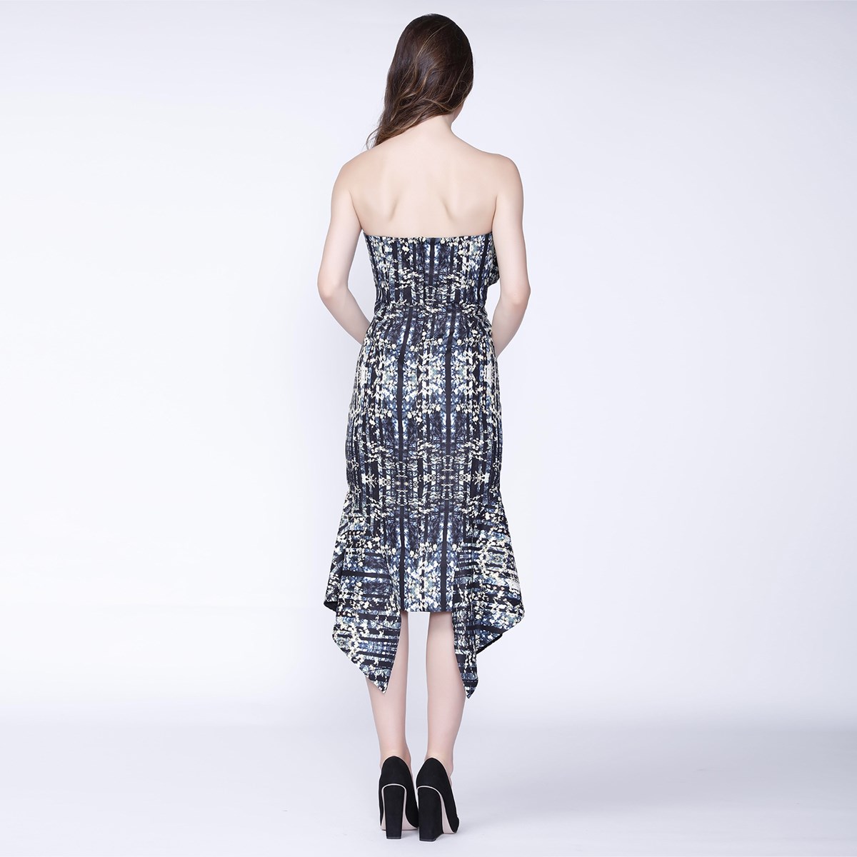 Robe cocktail imprimée, à coupe bustier ajustée à volants buste et basques