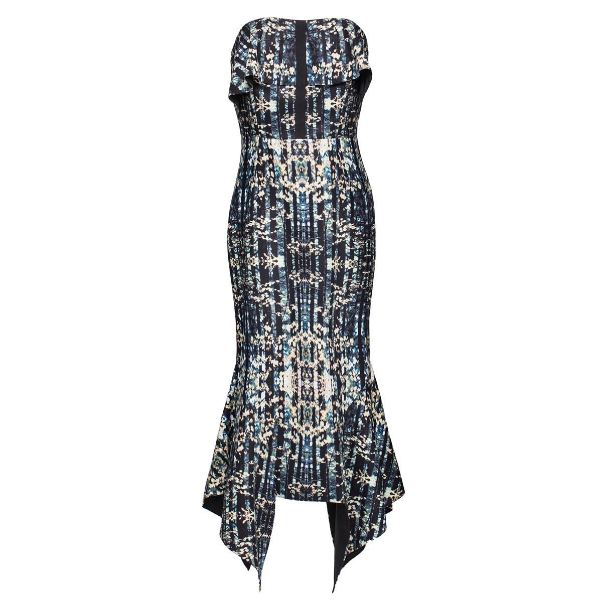 Cette robe bustier présente une impression placée de type kaléidoscope signée des studios S&J. Elle s’agrémente de larges volants sur le buste et aux cotés de la jupe qui dynamise la silhouette ajustée. Entièrement doublée de satin, accessoirisée de fine bretelles ajustables et détachables. Une vraie pièce de style qui ne passe pas inaperçue et convient à des occasions ou des soirées.