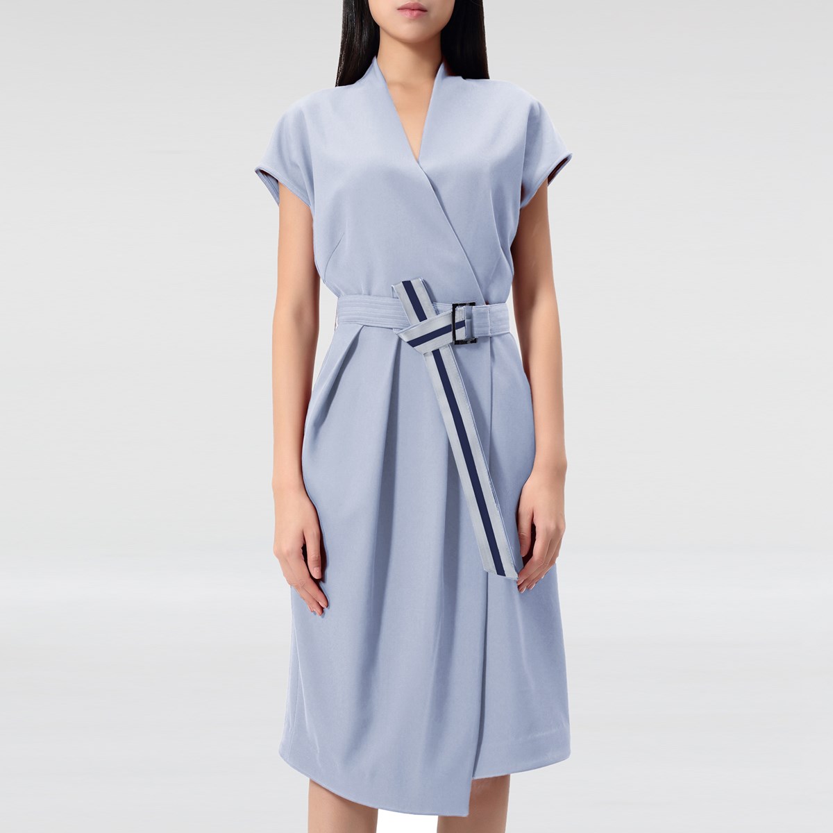 Cette robe est l’article hybride parfait entre les vêtements de jour et de soirée. Il vous donnera un look chic au travail et un style élégant lors des soirées. Avec sa séduisante encolure en V et sa ceinture ajoutée, cette pièce souligne en toute subtilité votre féminité. La coupe portefeuille n’est qu’un effet : la robe se ferme commodément avec un zip latéral sur le côté et révèle une fente sur le devant gauche. Coupé dans un sergé souple plombant qui donne du corps à l’ensemble de la pièce.