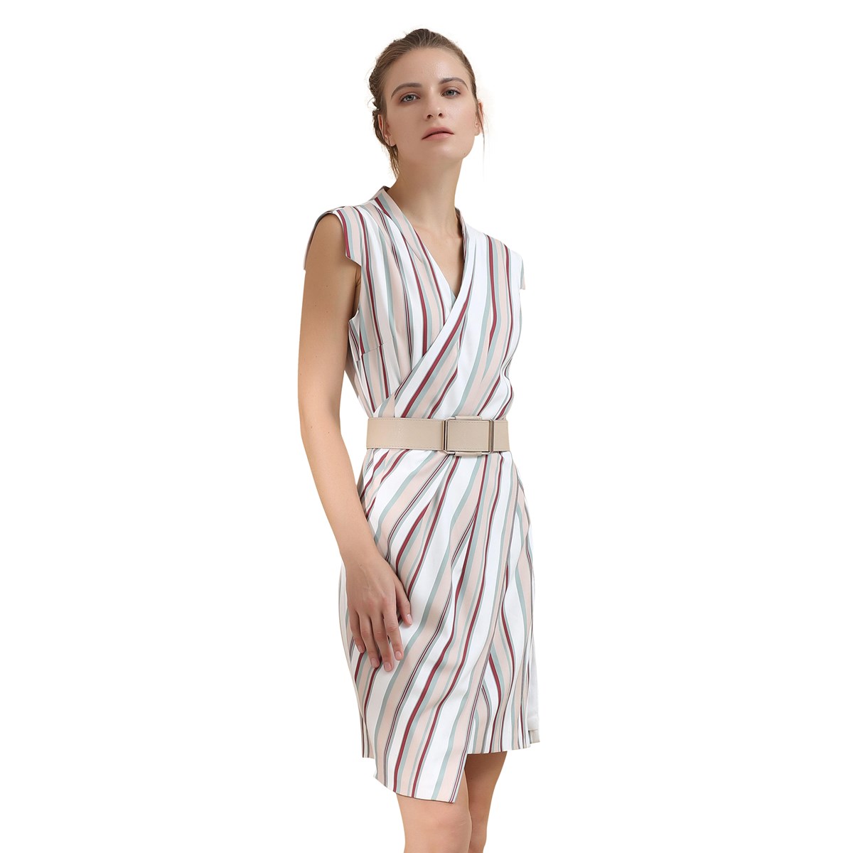 Une vraie pièce de style, cette robe présente une structure originale jouant avec l’orientation du motif rayé : un large panneau drapé transversal parcourt le devant de l’épaule gauche à la hanche droite et donne une effet portefeuille. Manchettes carrées, séduisant décolleté en V, vous ne passerez pas inaperçue. A porter en journée comme en soirée. Peut s’accessoiriser d’une ceinture (non fournie) pour une allure sophistiquée