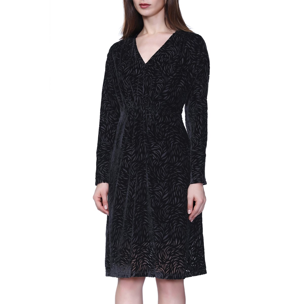 Cette robe est très facile à porter grâce à une taille ajustée élastiquée, des longues manches chauve-souris et un décolleté V décent. Son velours noir arbore un motif à effet dévoré et apporte une touche sophistiquée et un tombé élégant. Un style versatile qui convient aussi bien à une journée au bureau ou à une soirée chic. S’accessoirise facilement avec par exemple des talons colorés et un sautoir.