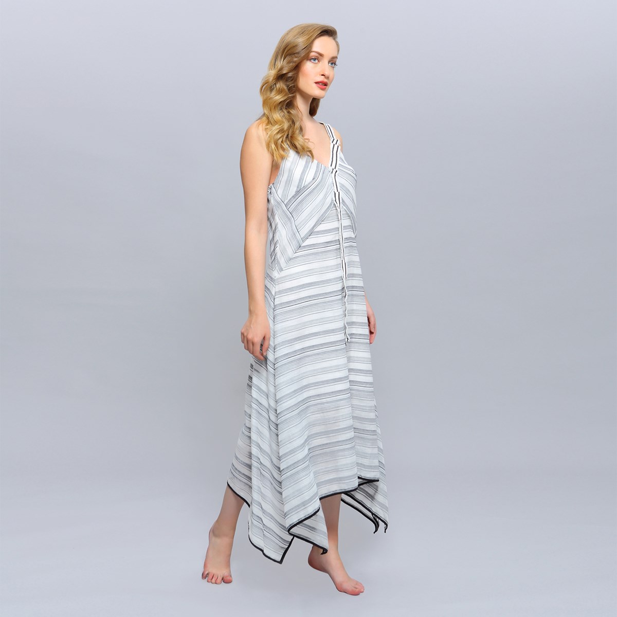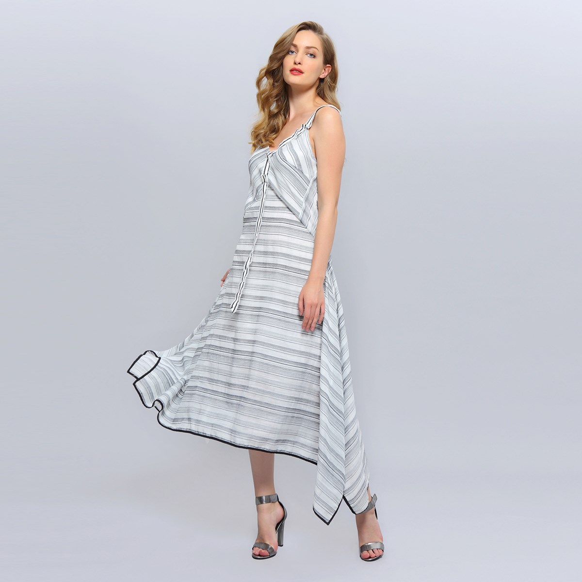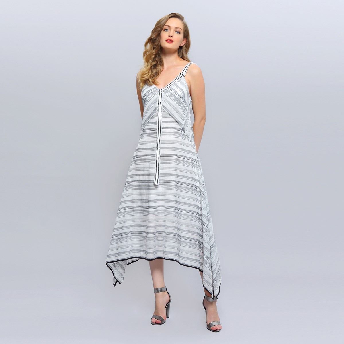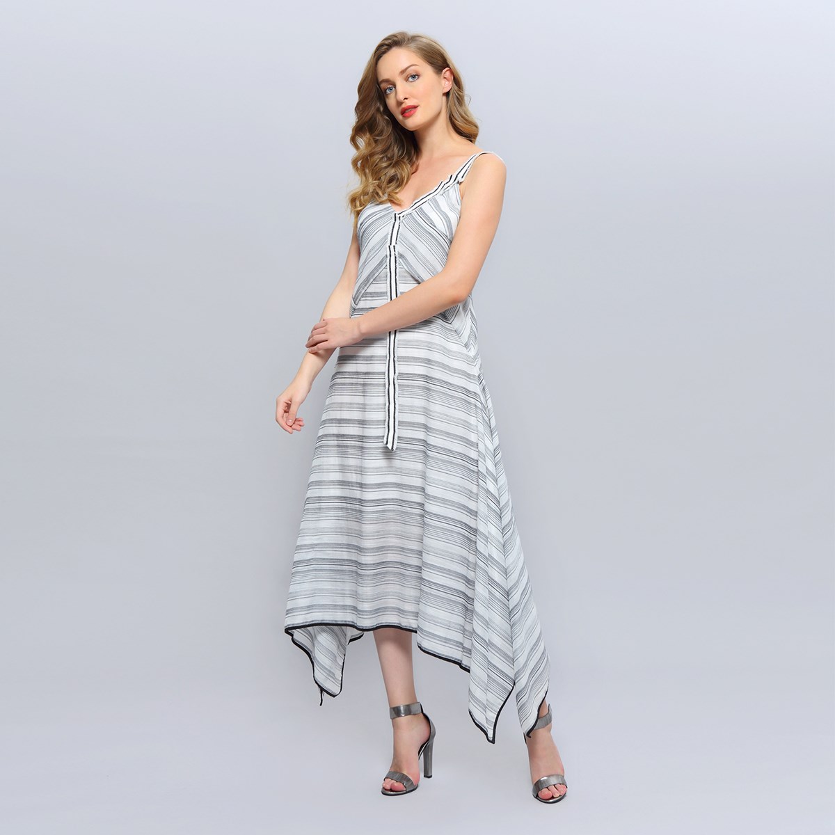 Une coupe atypique qui offre des jeux de rayures et une structure qui met en valeur votre silhouette avec son buste ajusté et son décolleté en V séduisant. Elle présente un joli volume grâce à la généreuse jupe trapèze plongeante sur les côtés. Vous adorerez ce voile fluide transparent léger et le galon décoratif placé sur le côté gauche. La robe est entièrement doublée d’une viscose respirante. A porter le jour et lors de vos prochaines «garden-parties» d’été. Soyez sophistiquée en l’associant à des talons ou optez pour le style décontracté avec des sandales plates.