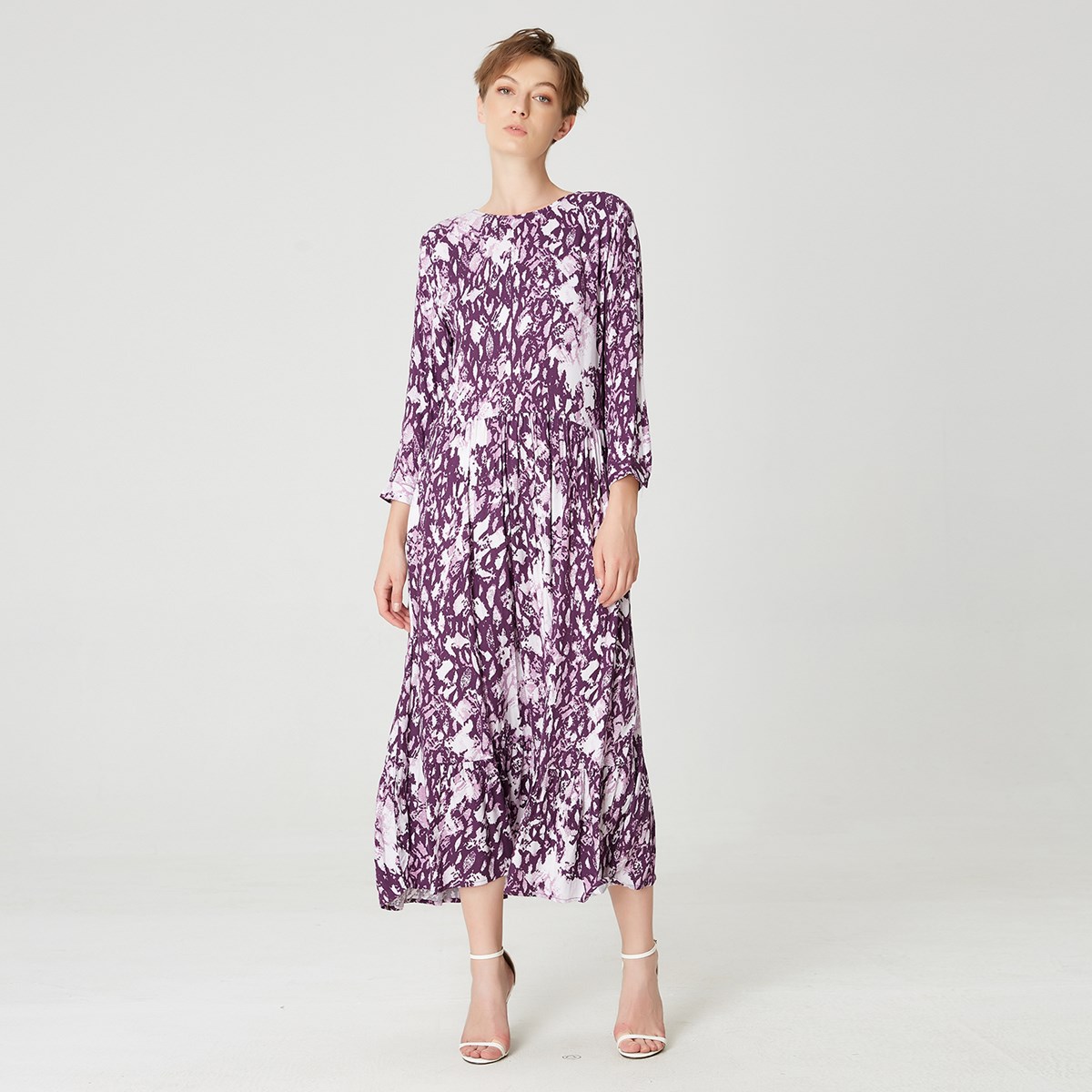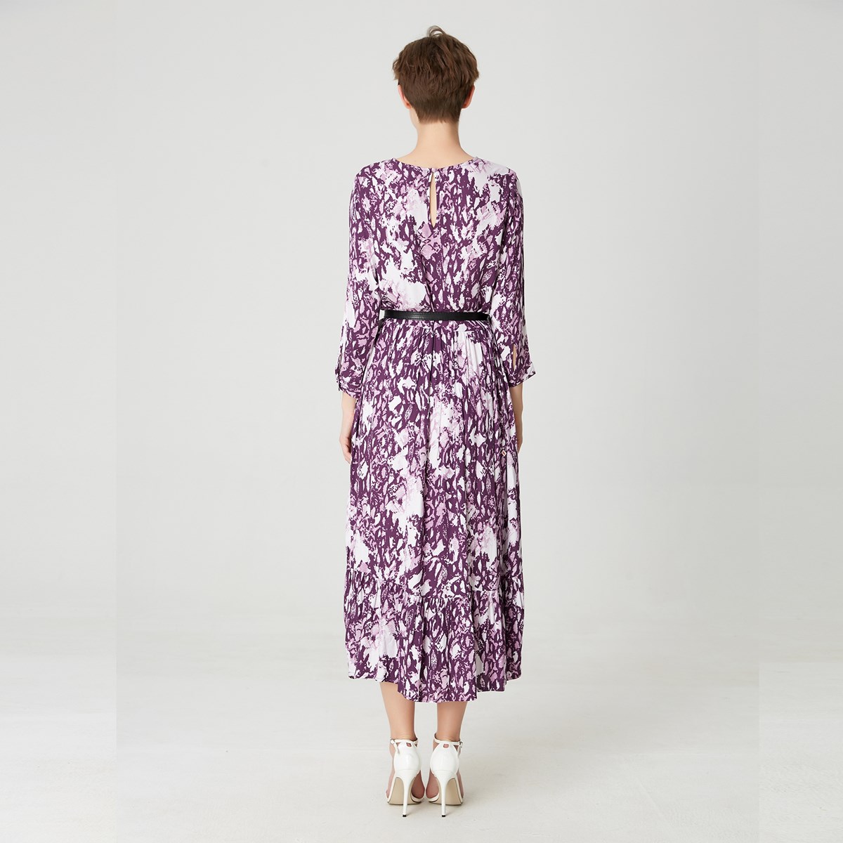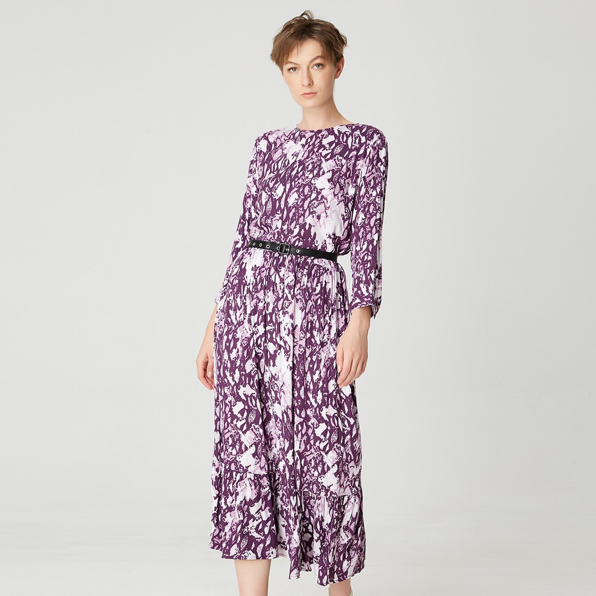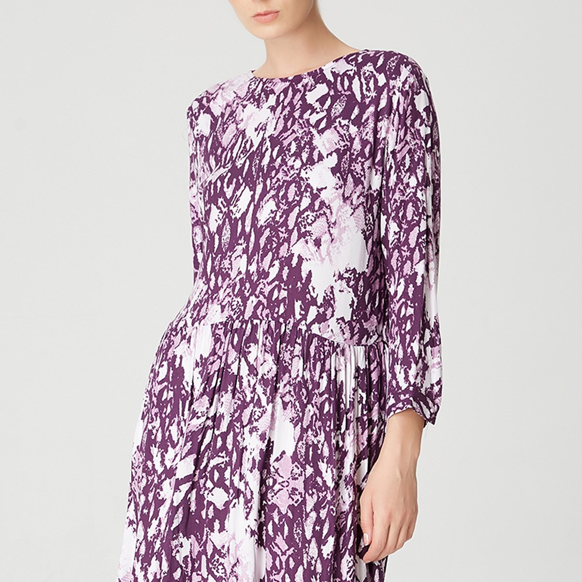Orné d’un imprimé animal violet, cette robe colore votre garde-robe. Une coupe ample avec un volume de jupe généreux, manches chemises, col arrondi, sa ligne élégante et féminine peut se souligner à la taille par une ceinture. Une pièce versatile, à porter en journée comme en soirée.
