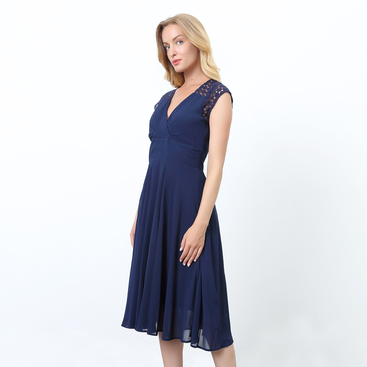 Grâce à la taille ajustée, au volume généreux sur la jupe et à la longueur genou élégante, cette robe est flatteuse pour tout type de silhouette. Subtil jeu de transparence aux épaules et aux manchettes avec l’empiècement en dentelle et séduisant décolleté V. Cette pièce intemporelle est un incontournable pour toute garde-robe et apporte séduction et féminité à votre look en journée comme en soirée.