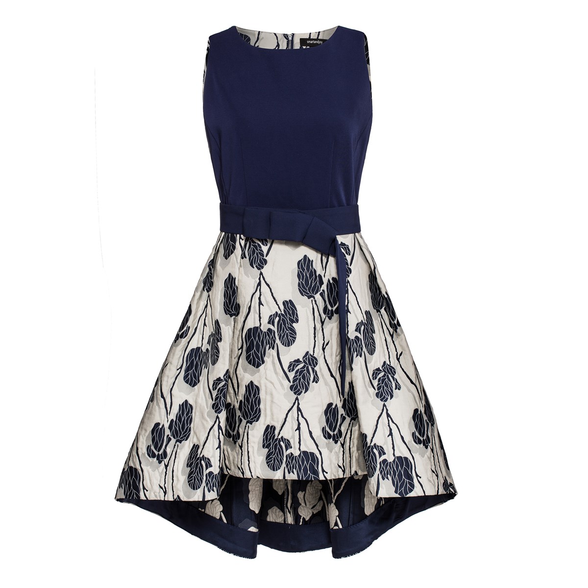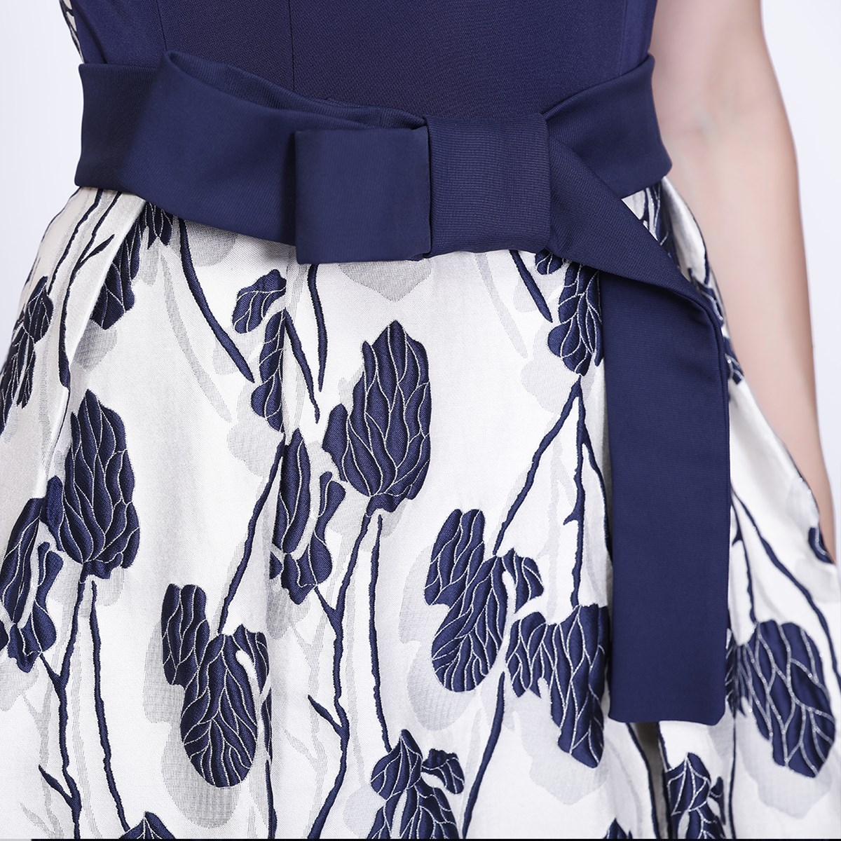 Un buste ajusté associé à une jupe à l’ourlet plongeant et au volume généreusement évasé : une coupe conçue pour flatter votre silhouette. Le jacquard fleuri apporte une touche de romantisme tandis que les aplats de couleur bleue structurent l’ensemble. Ceinture séparée avec nœud fournie. Une robe qui vous accompagnera lors de votre prochain cocktail ou soirée avec grâce et élégance.