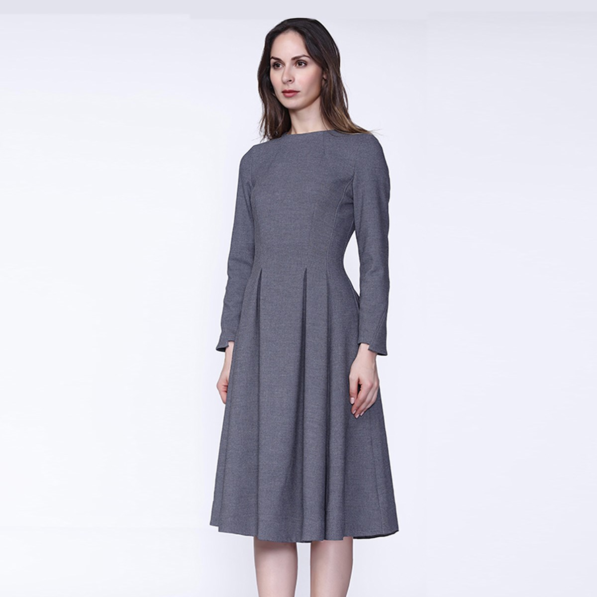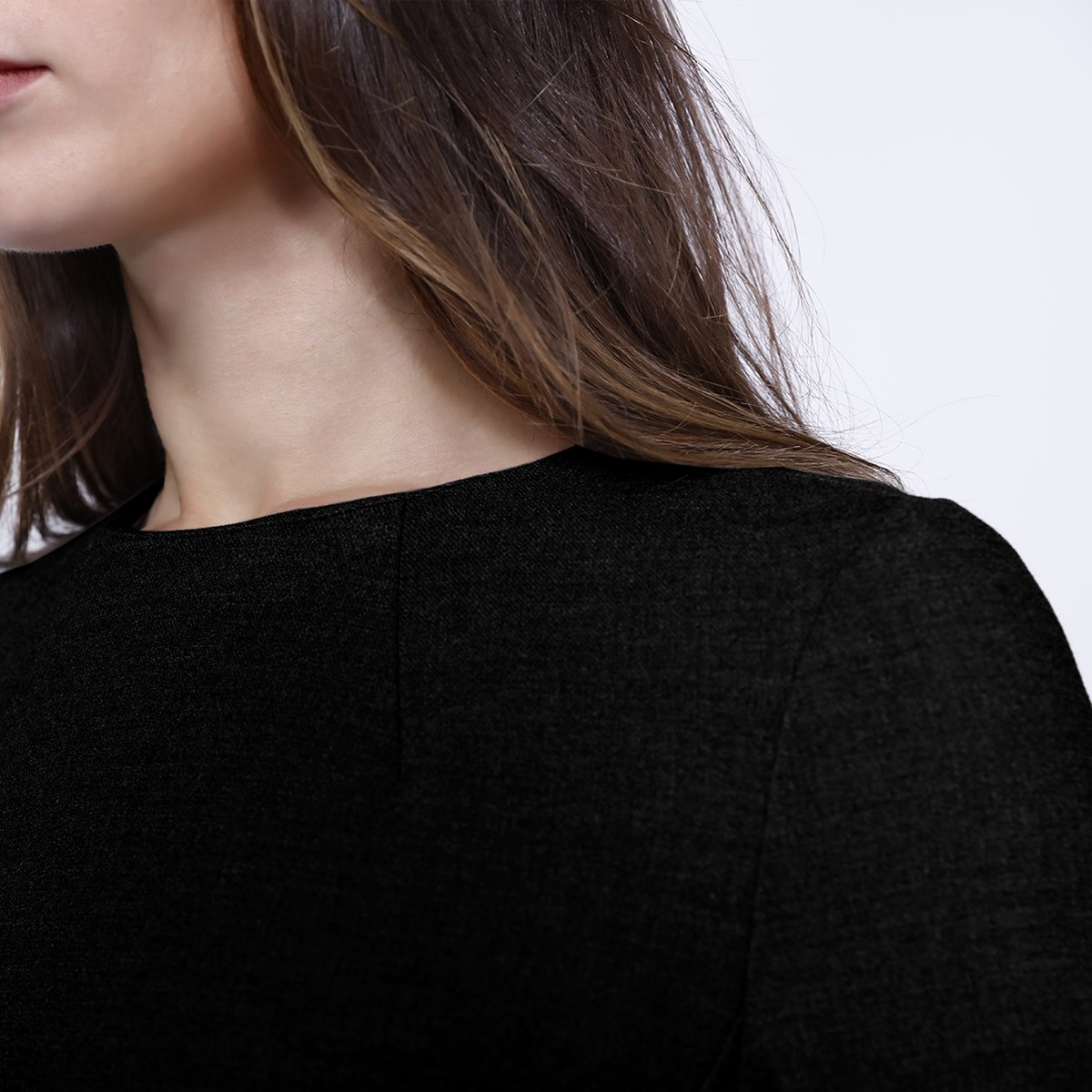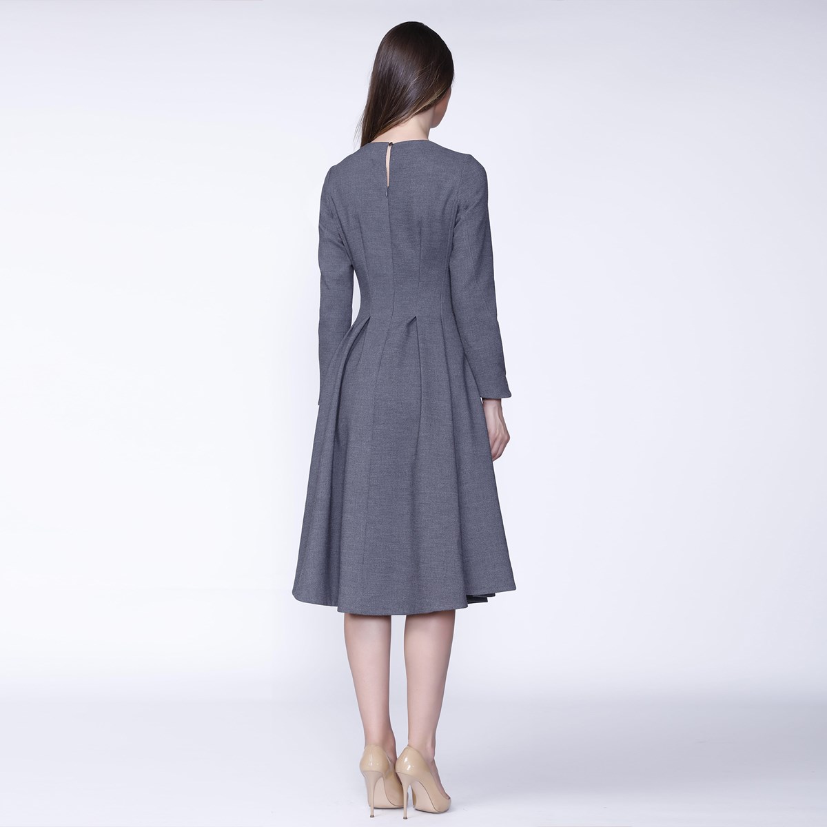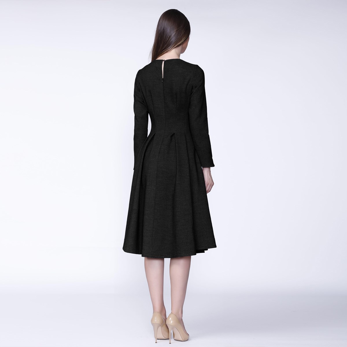 Une coupe intemporelle qui reste une valeur sûre au cours des saisons, cette robe met élégamment en valeur la silhouette : buste et taille cintrés, jupe a large volume, poches côtés, manches longues.  Parfaite pour une tenue de bureau, elle convient également à une pièce de sortie.