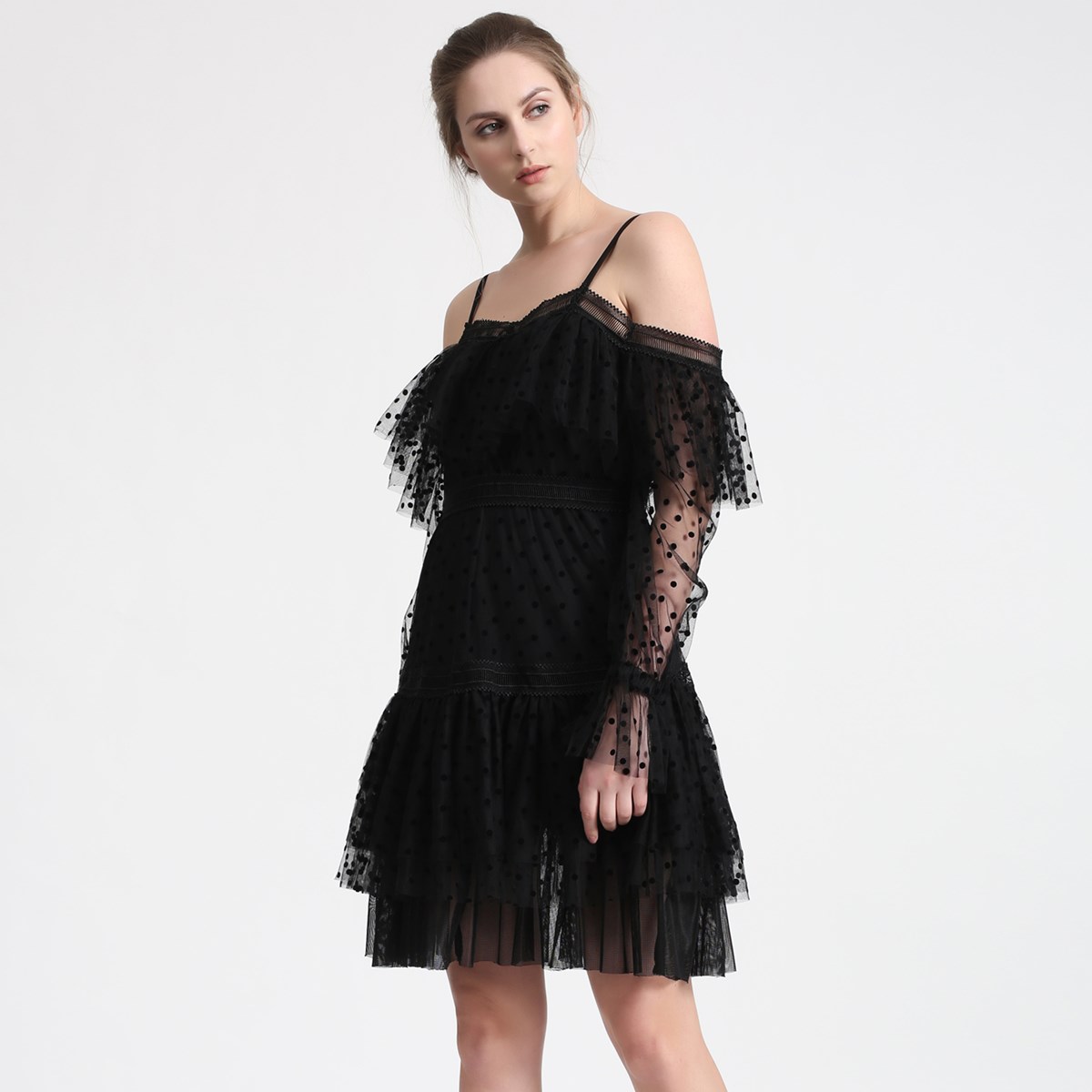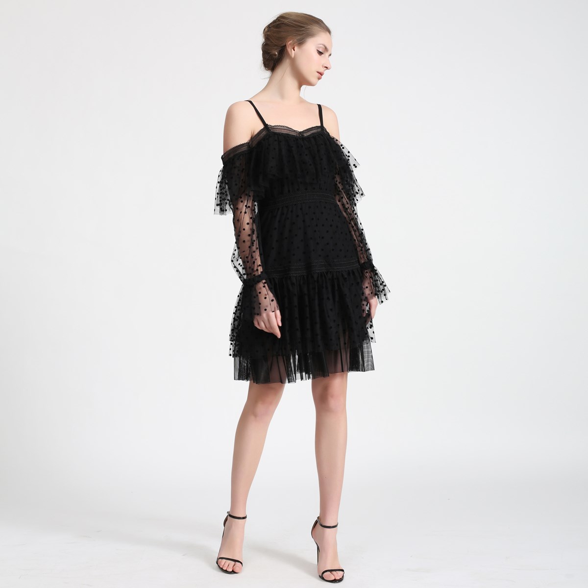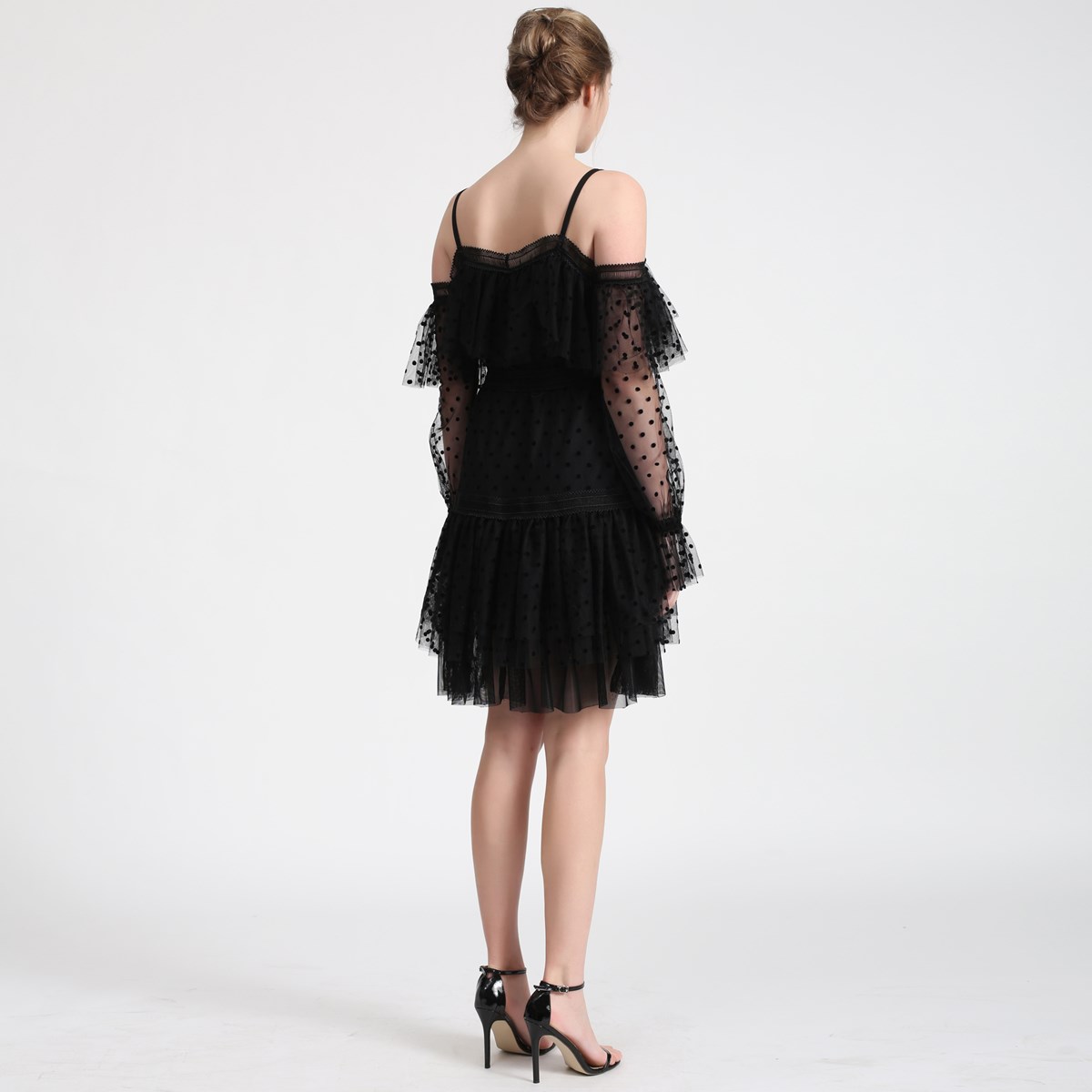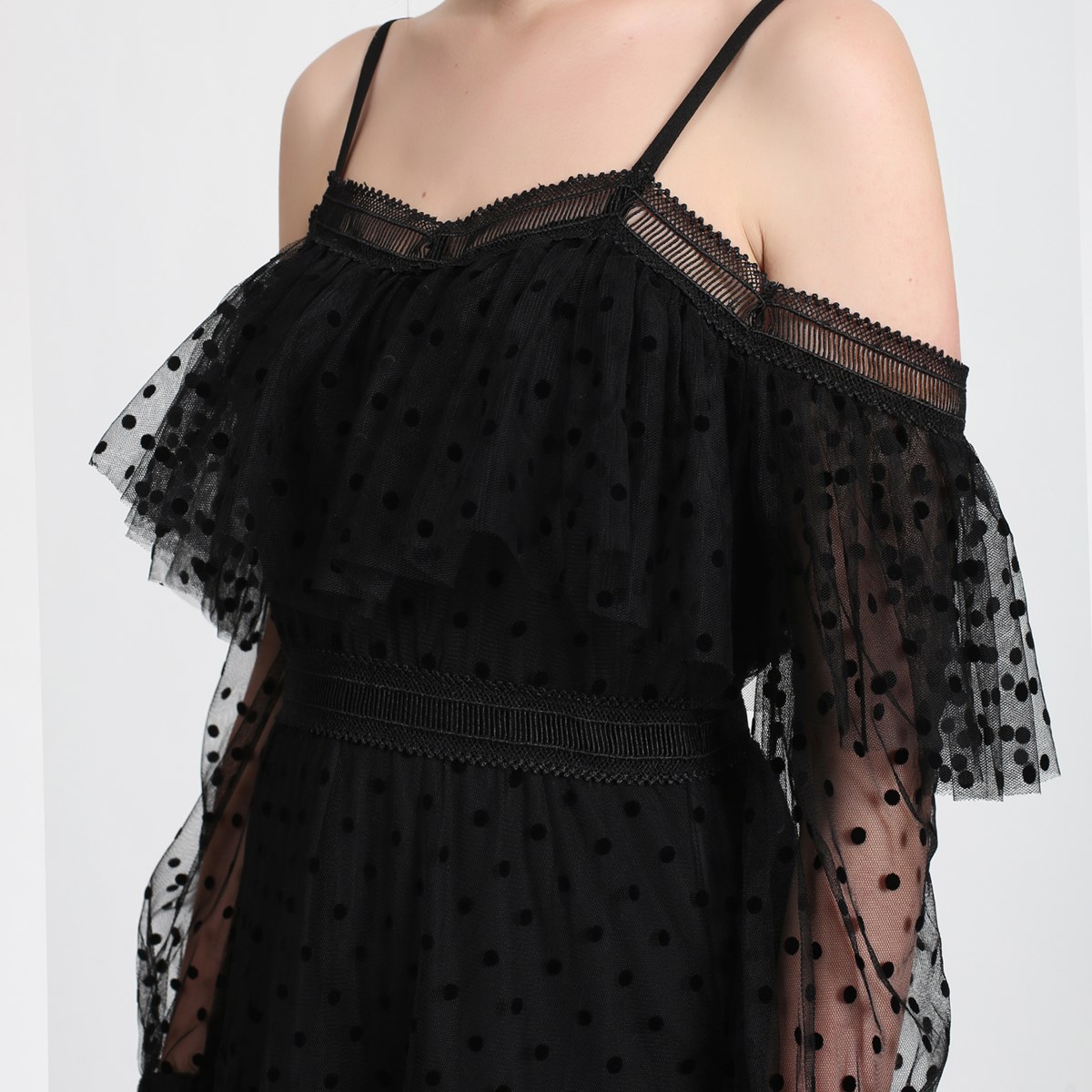 Equilibre entre romantisme et séduction, cette robe ose s’inspirer d’un négligé sophistiqué. Une pièce qui joue délicieusement avec les transparences en utilisant une tulle à pois et un galon de dentelle le long du décolleté et des épaules. Coupe bustier sur le devant avec fines bretelles et épaules dénudées, volume de jupe généreux créé par plusieurs niveaux de volants.