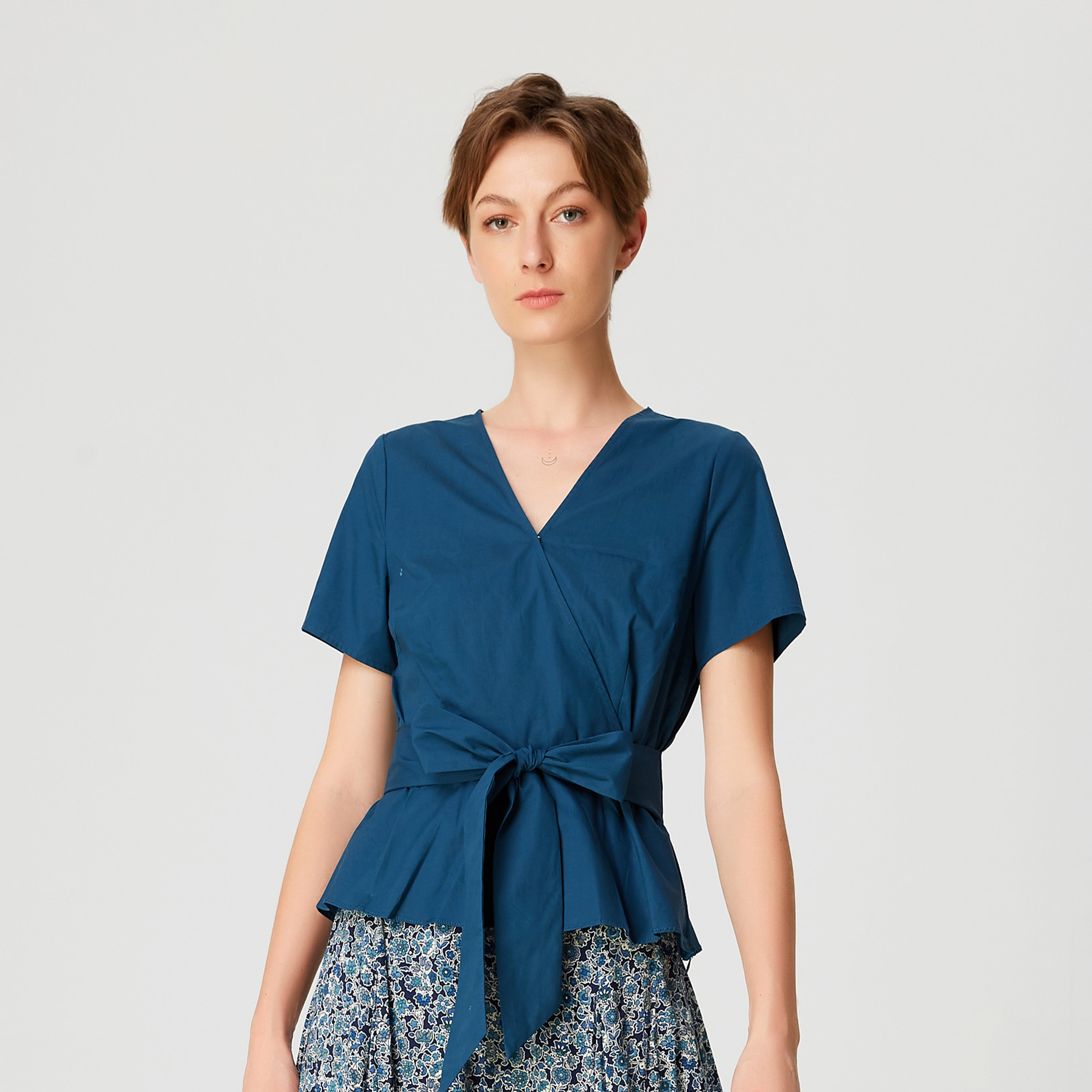 Une coupe féminine et raffinée, ce top s’agrémente d’une large ceinture à-même à nouer, soit devant, soit au dos au grès de vos envies. Le buste est élégamment mis en valeur par l’encolure en v avec effet cache cœuret les pinces poitrines. A associer avec une jupe droite ou un pantalon cigarette.