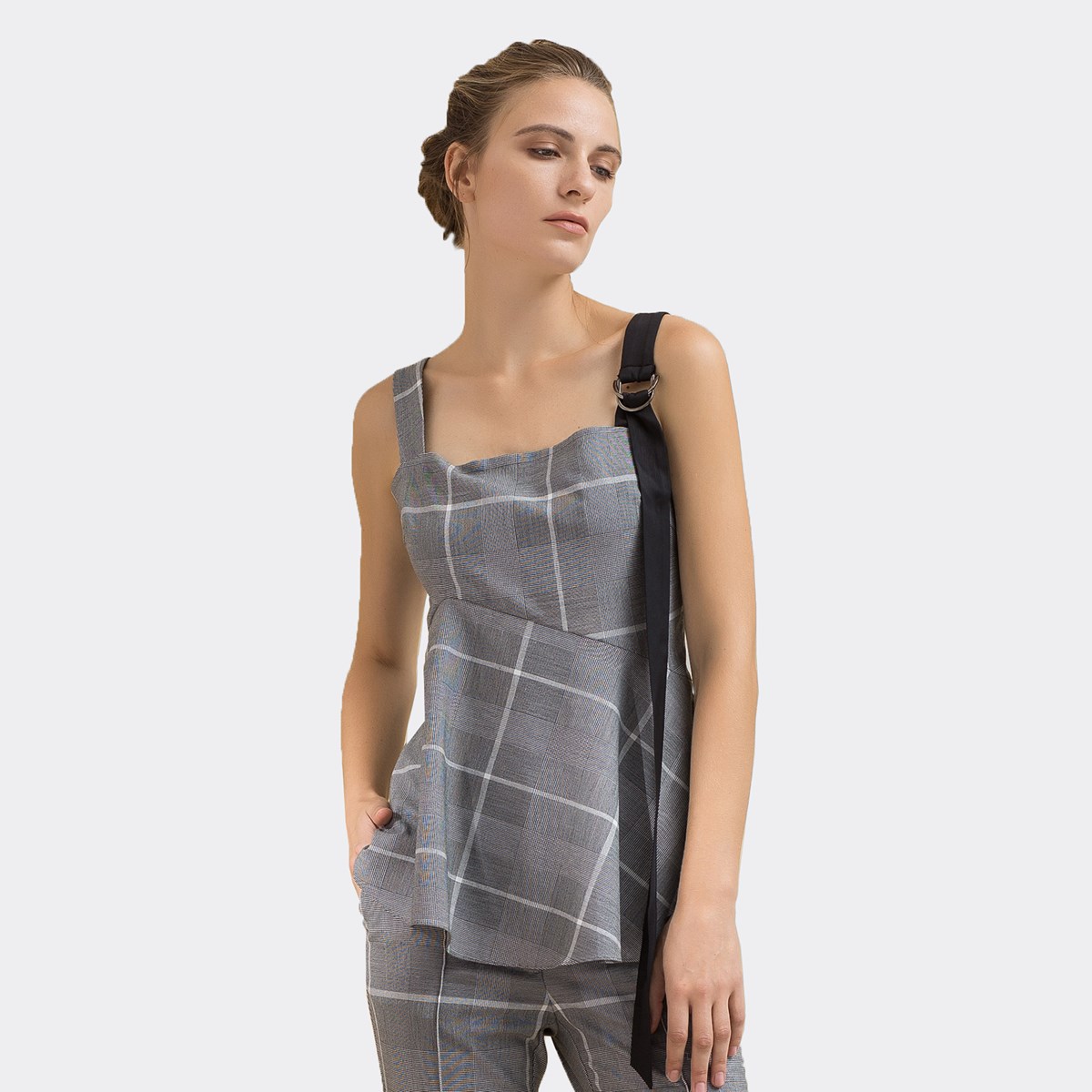 Une coupe atypique à larges bretelles, buste ajustée et basques évasées. Large bande satin ornée d’une boucle et tombant le long du corps. Tissu très actuel à larges carreaux et légèrement stretch. A porter avec une jupe crayon ou un leggin noir ou à associer avec notre Pantalon tartan cigarette pour jour un « total look ».