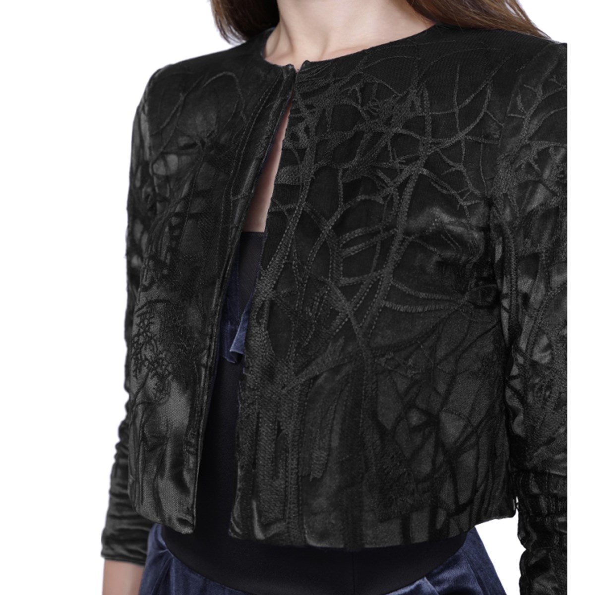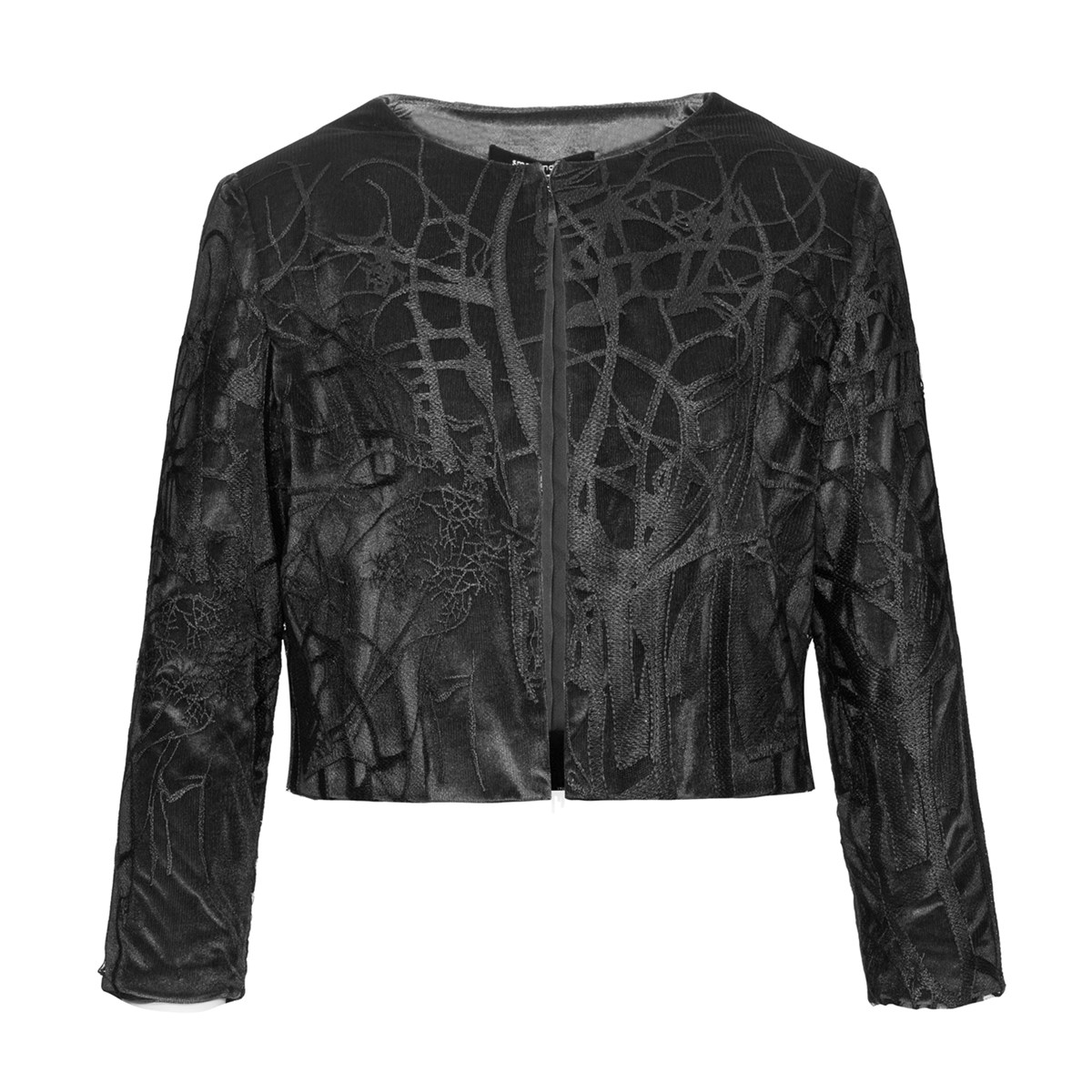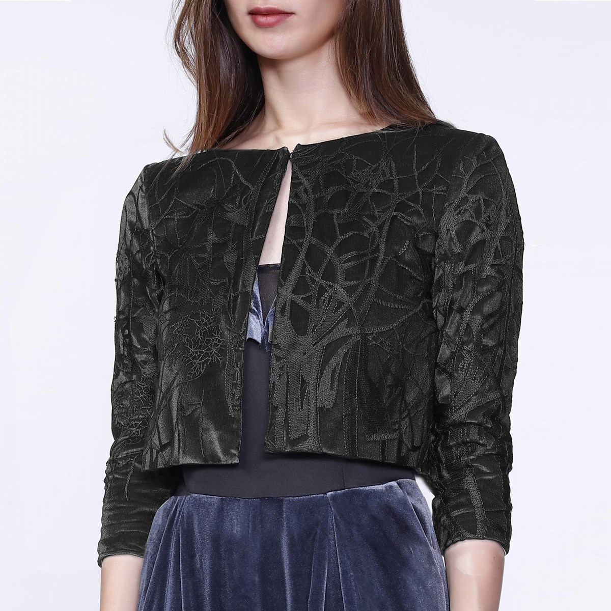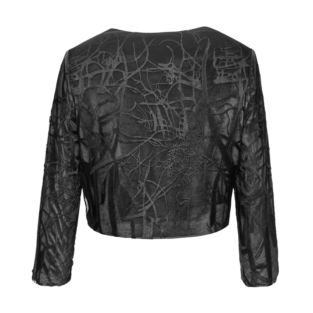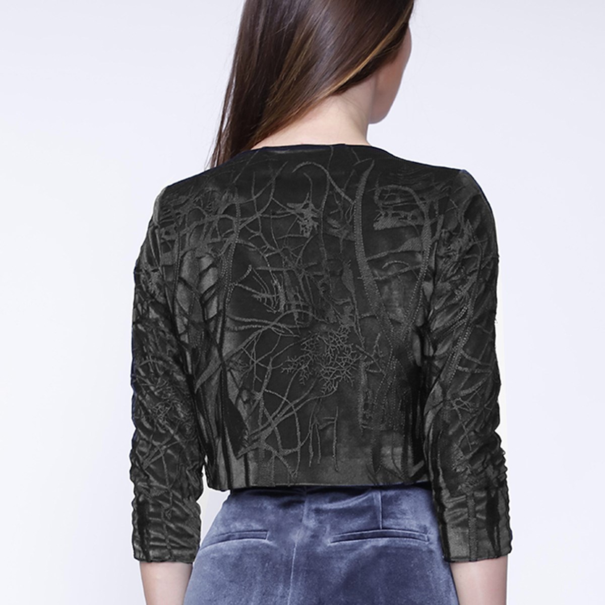 Cette veste courte est composée d’une couche de dentelle raffinée sur le dessus et d’un tissu velours en dessous qui apporte un effet brillant subtil. Fermeture bord à bord par un simple crochet sur le devant. La pièce est entièrement doublée avec un tissu satiné légèrement stretch apportant ainsi douceur et confort. Un complément très pratique à votre garde-robe pour accessoiriser vos robes de soirée sans manche. Vous pouvez également l’assortir à notre Jupe mi-longue bouffante en dentelle à motif forêt.